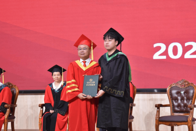 致辞完毕,喻国辉经理为每一位同学拨穗正冠。当流苏从右至左轻拂,是知识沉淀的见证,更是责任与使命的交接。导师们与毕业生握手、合影,目光里满是欣慰与祝福,这一个个瞬间,定格成青春最珍贵的剪影。