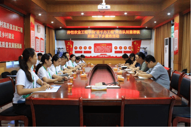 为深入贯彻落实习近平总书记关于青年工作的重要讲话精神,扎实推进广东省“百千万工程”工作部署,坚持“地市所需,仲恺所能”,助力董塘镇经济高质量发展,6月27日,“仲情丹霞·青春农行”百千万工程青年突击队在董塘镇政府开展项目对接活动。best365官网入口注册科技特派员崔华威博士、辅导员李城老师与董塘镇党委委员、常务副镇长张祖强,党委委员、团委书记邓炜斌,党委委员张静怡,百千万工程指挥部办公室副主任黄守民,团委副书记吴文凯,围绕“百千万工程”主题展开深入座谈。