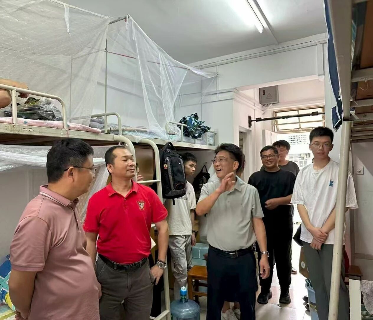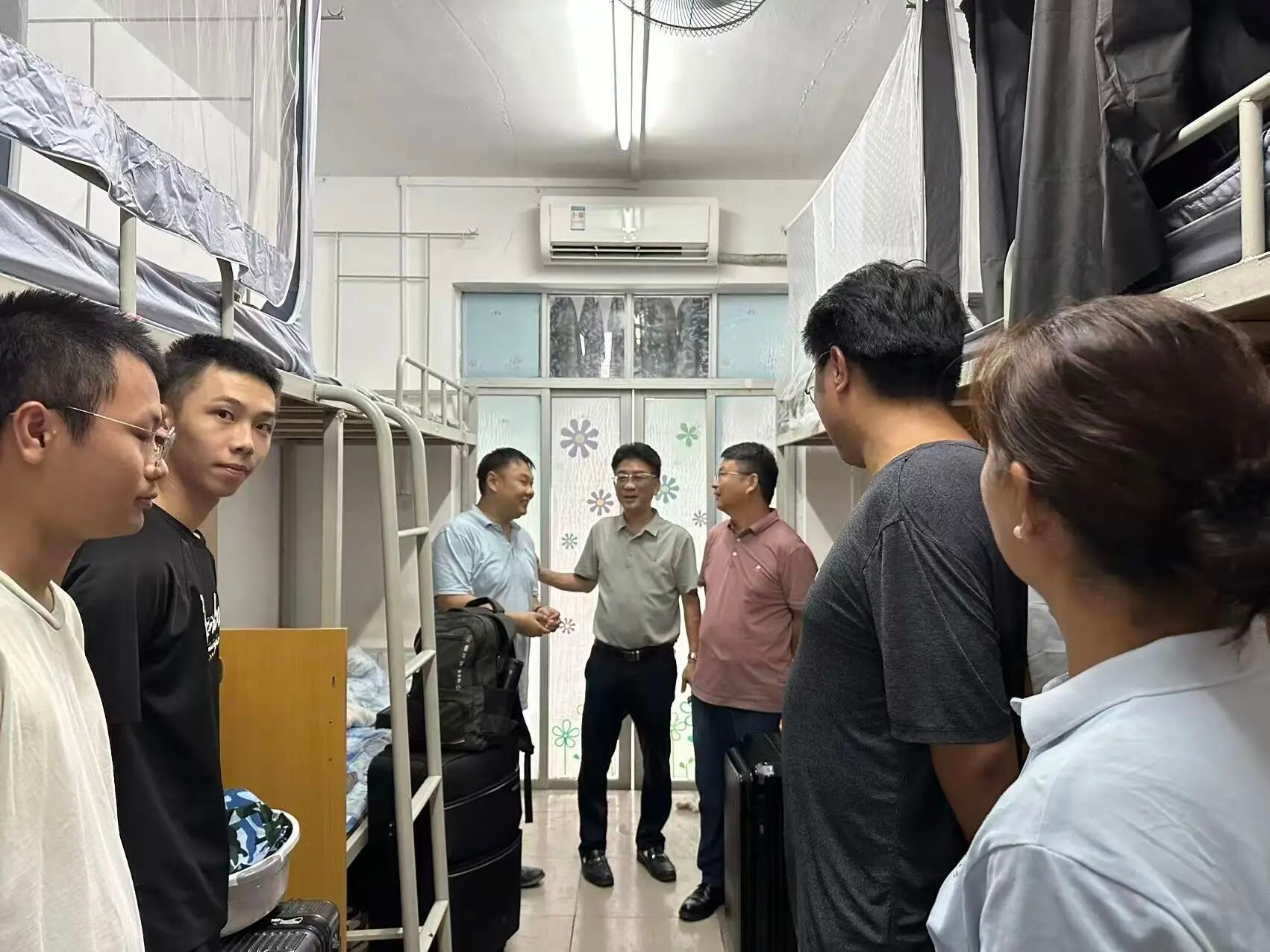 当天下午,周超雄书记、喻国辉经理、张金凤副书记、班主任孙伟、王凯以及辅导员李城、梁定超等一同走访了新生宿舍,为新生送上温暖的问候与关怀。周书记一行仔细查看宿舍情况,与新生亲切交谈,详细询问新生对新环境的适应情况,耐心解答疑问,暖心提醒大家做好军训准备、防暑防蚊,鼓励大家互帮互助,更快适应老员工活,融入公司的大集体。