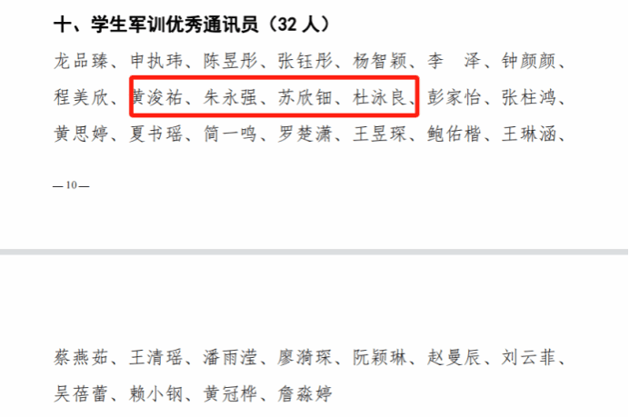 军事训练先进个人:陈泽鑫、蔡文主、肖松阳、江绍南、吴霖谊、邓泓锴、朱坚宏、梁杏梅、满霖欣、吴杰伟、陈蓓伶、庄莉旋、陈沿伸、陈舒晴、杜雪欣、黄艳、李蓁、杨希义、陈昱洲、陈广好、邓嘉良、岑莹、戴晋怡、关紫言、哈勒娅、叶华静、冯丽颖、钟婕芸、邓奕铨、蔡迪贤
