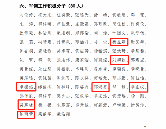 军训工作积极分子:杨昱婷、刘奕钦、李德焰、郑鸿基、李主权、吴惠晓、陈琦萱