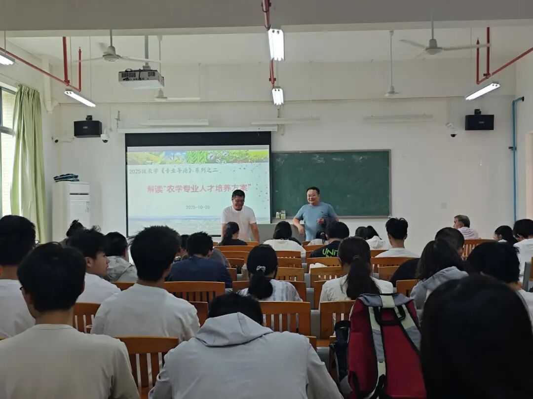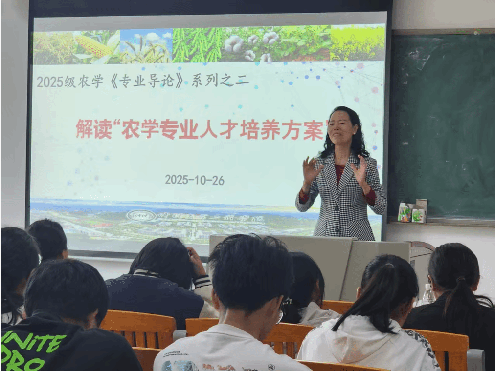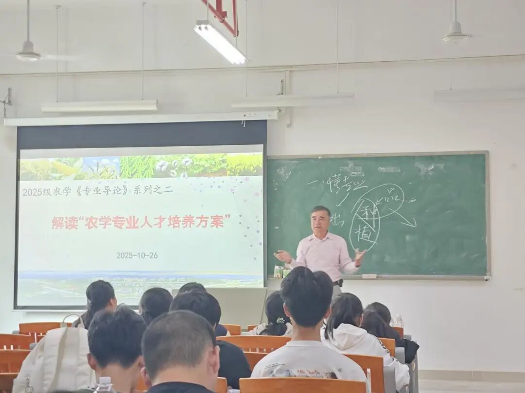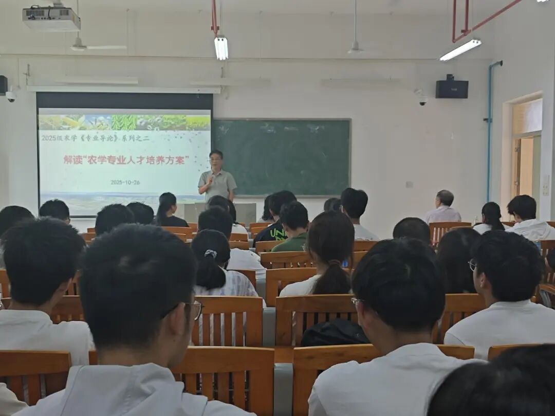 2025 年 10 月 26 日上午,best365官网入口注册农学系在生命科学大楼 A 栋 507 教室,为 2025 级农学专业全体同学开展《专业导论》专题讲座。本次课程聚焦 “农学专业人才培养方案” 解读,由农学系系主任、班主任孙伟副教授主持,蒋锋副教授主讲。公司特别邀请公司党委书记周超雄、退休专家谢振文教授、赵玉环副教授,以及 2015 级优秀员工林金利返校作分享,为新生成长成才提出殷切期望。