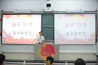 团课开讲前,全体同学起立,奏唱共青团团歌。待奏唱完毕,苏登以自身经历为切入点,讲述了七十年来国家飞速发展给个人和社会带来的积极影响。接着,他带同学们回顾了新中国成立到第一个五年计划、改革开放到如今开创新时代、奋力实现中华民族伟大复兴的艰辛探索,并用图片生动展现了中国从封闭落后到强大开放的辉煌历程。苏登还简要阐述了祖国在经济建设、政治道路、文化发展、民生建设和生态文明建设等五个方面所取得的巨大成就,表达了中国坚持改革开放,坚定走中国特色社会主义道路的正确性和必然性。