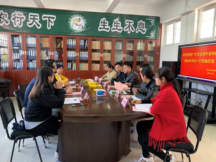 2019年11月29日,广东省外语艺术职业公司应用外语公司党总支书记杨永华一行4人到公司交流学习。公司党总支书记陈丹雄、副书记周超雄,辅导员周静静、高结怡、苏登、孙晓芳参与交流。交流会由陈丹雄主持。