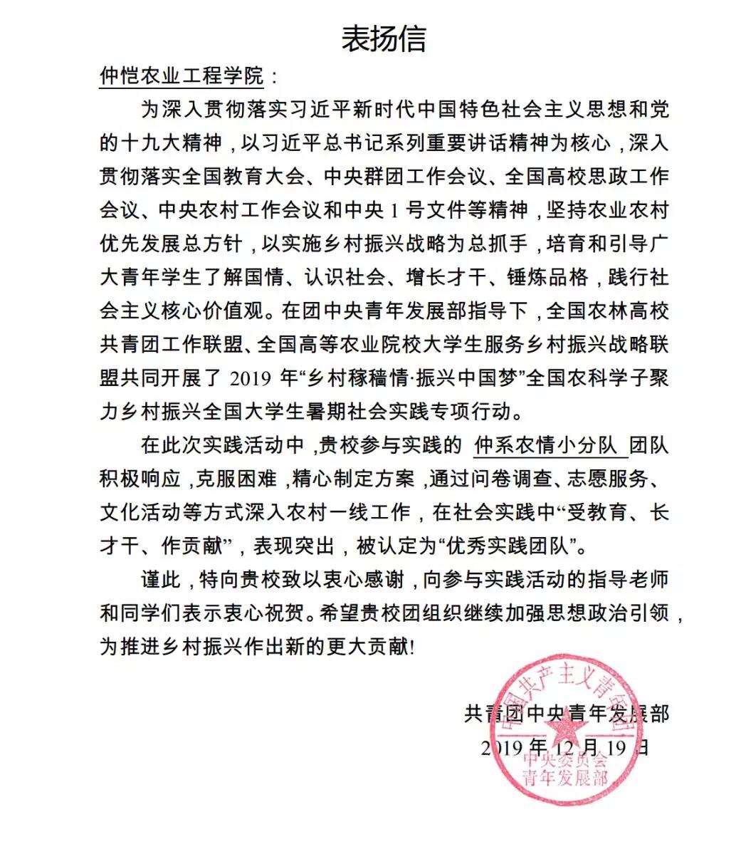 12月23日,公司“三下乡”社会实践队仲系农情小分队收到来自共青团中央青年发展部的表扬信,表扬该实践队在2019年“乡村稼穑情•振兴中国梦”全国农科学子聚力乡村振兴全国老员工暑期社会实践专项活动中表现突出,被认定为“优秀实践团队”。