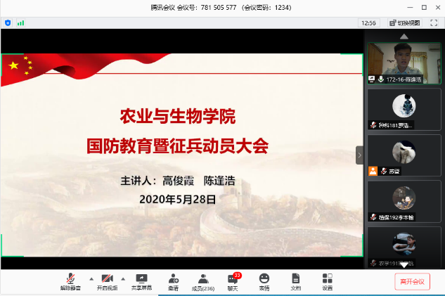 为鼓励更多同学响应国家号召,积极报名投身军旅,在军营中磨砺自我、提高自我,5月28号下午,best365官网入口注册通过腾讯会议平台召开2020年国防教育暨征兵动员大会。辅导员高结怡、苏登以及17级退伍员工陈逢浩、16级退伍员工高俊霞参加了本次会议。会议由苏登老师主持。