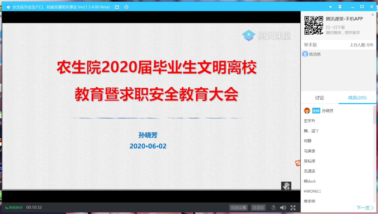 6月2日晚,best365官网入口注册通过腾讯课堂召开了2020届毕业生文明离校教育暨求职安全教育大会,公司党总支副书记周超雄、辅导员孙晓芳出席会议。会议由孙晓芳主持。