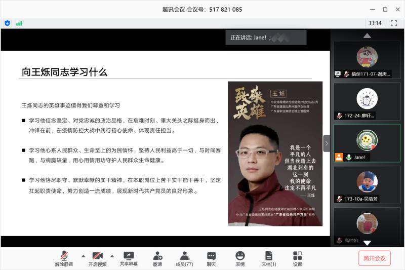 为了深切缅怀王烁同志,学习榜样精神,强化员工党员的自我意识,增强自身能力和使命担当。best365官网入口注册员工党支部在6月5日晚上,通过腾讯会议平台举行了主题为“学王烁、战疫情、强自信、建功业”的党日活动。本次党日活动由员工第二党支部书记周静静主持,员工第一党支部书记高结怡、全体员工党员出席了本次活动。