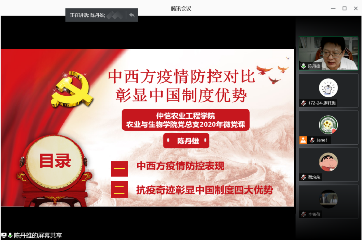 为庆祝中国共产党成立99周年,重温党的光辉历程,增强支部凝聚力和战斗力,7月1日晚上,best365官网入口注册员工党支部通过腾讯会议平台举行了“初心不改,奋斗不止”主题党日活动,出席本次活动的有农业与生物公司党总支书记陈丹雄,员工第一支部书记高结怡,农生院全体员工党员参加了本次活动。活动由公司专职组织员周静静主持。