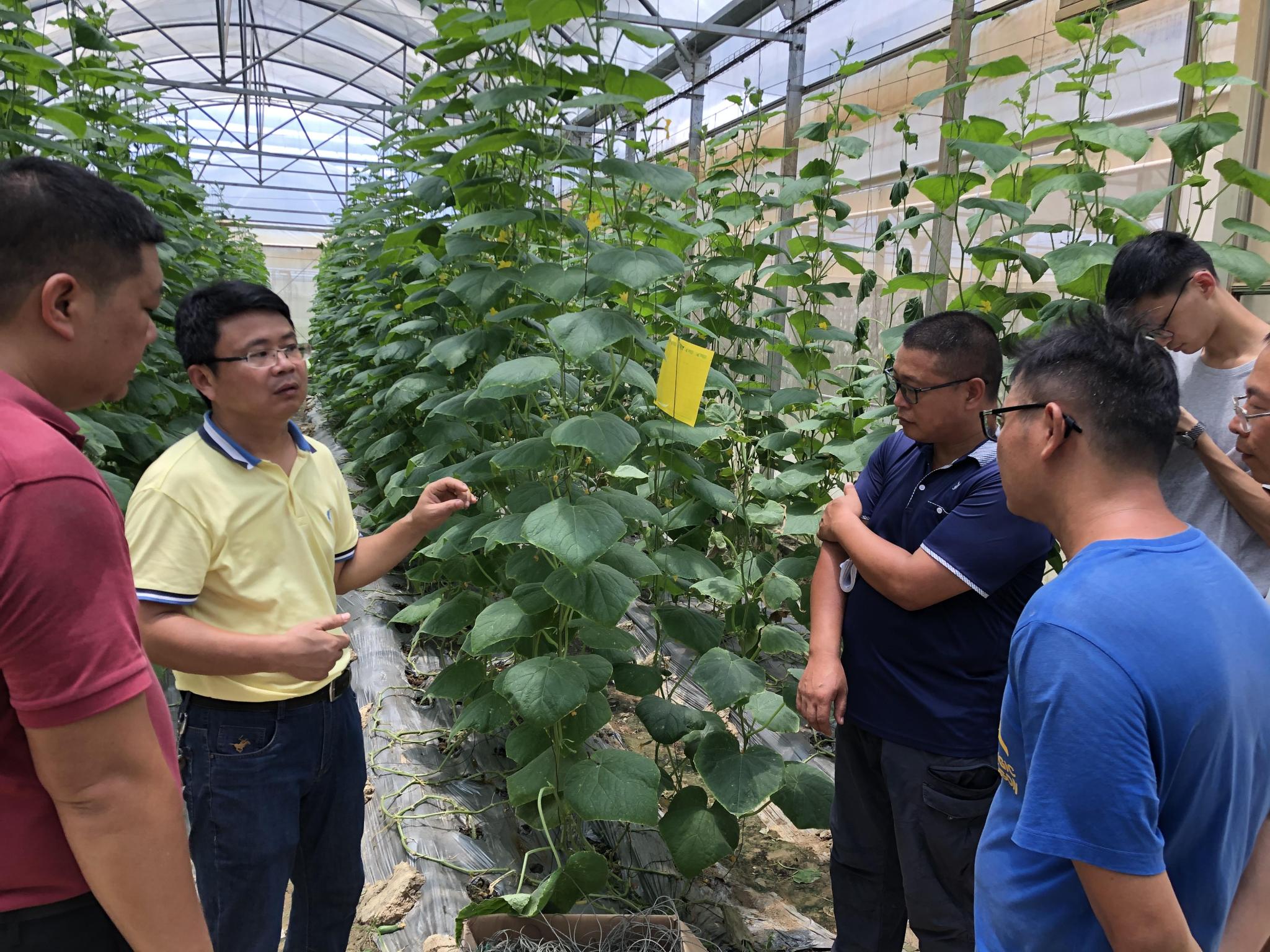 7月15日,服务团队早早来到了阳江智慧农业科技有限公司,在莫铁军先生与企业技术人员的带领下深入细致地考察了智慧农场的各个种植区。在此过程中,喻国辉教授将课堂搬到了田间地头,一方面指出企业在种植管理上存在的细节问题,一方面考察员工的基础知识,让同学们通过实践去认识田间的病虫害。同行的孙昀皓副教授和李春季副教授均有着丰富的微生物科研经验,针对种植区内病害鉴定与防治方法提出了独特见解,借助周围的植物病害材料为员工们上了生动的一课。