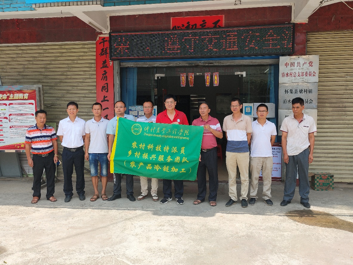 为积极响应《广东省乡村振兴科技计划》的号召,坚决落实省、市和公司服务“三农”的总体工作部署,作为108支“仲恺军团”的战斗队之一,农产品冷链加工服务团队与“三下乡”老员工乡村振兴服务队一行7人,在best365官网入口注册教工第二党支部书记陈大清教授的带领下,于2020年7月20日上午汇集怀集县粱村镇洊水村村委会,开启了以现代农业为导向,产业扶贫助推洊水村农产品品牌建设的紧张有序工作。