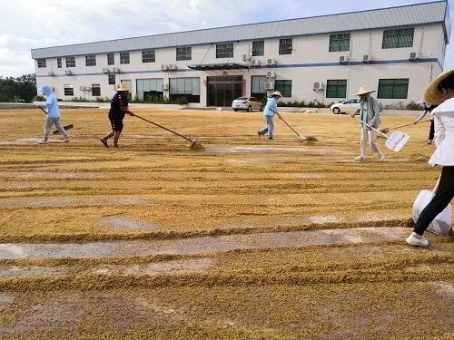 8月4日,团队协助优食公司抢收稻谷。优食公司经费不足,没有购置烘干机,收割完的稻谷只能人工晒干,由于稻谷数量大,为了节省人工和时间成本,未晒干的稻谷夜间不收回。不料天意难测,一场大雨将4万多斤稻谷全部淋湿。淋过雨的稻谷极易发芽,为了减少损失,公司只好将湿稻谷低价卖给烘干厂。该问题引起了团队成员的深思和讨论。水稻产业的经济产值较低,且成本高、风险大,因此提高机械化水平,减少人力物力成本,是解决此类问题的有效方法。