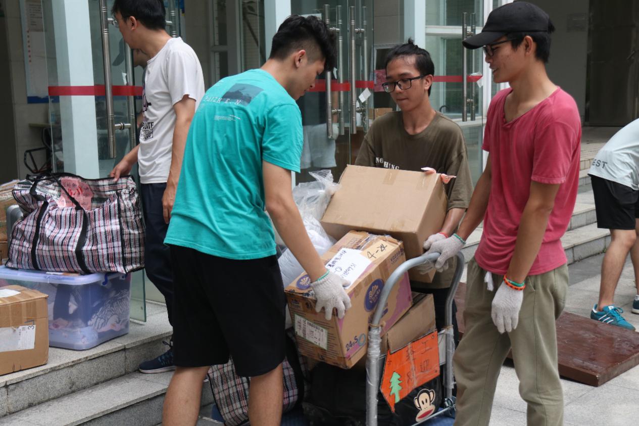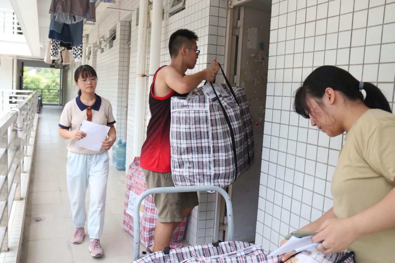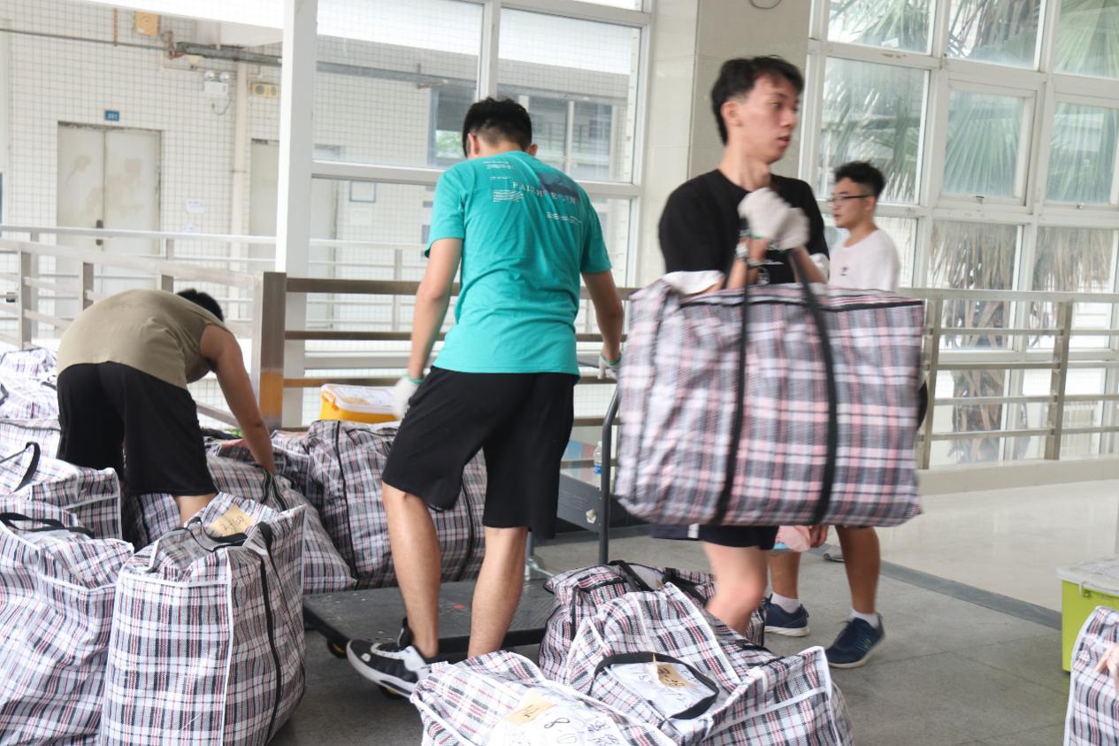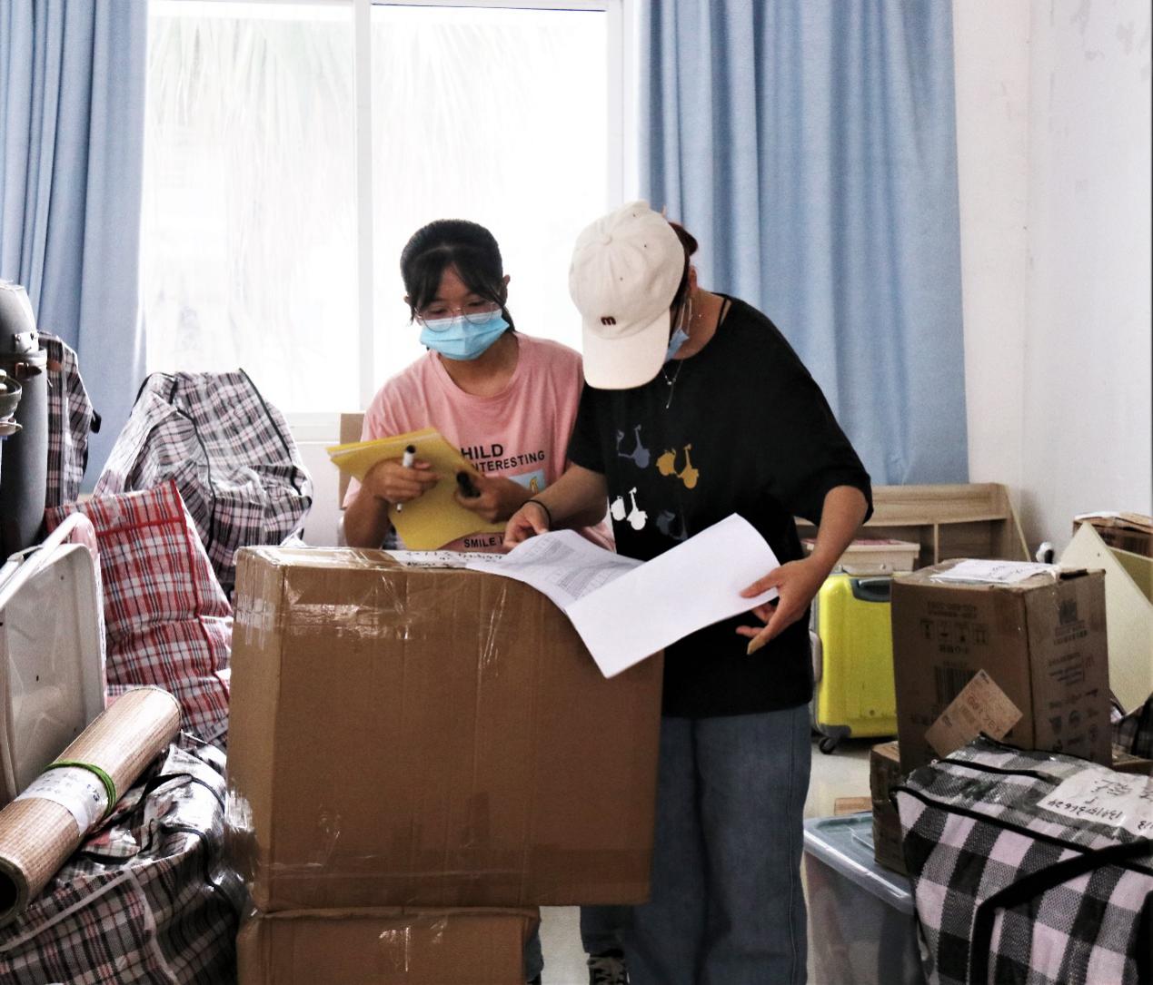 在杨钊杨勋楼暂放行李的教室里,女生志愿者认真对照着行李上标注的原宿舍标签,为其贴上对应的新宿舍的标签,男生志愿者们搬运、并协助搬运工人装车运送至3栋宿舍楼。