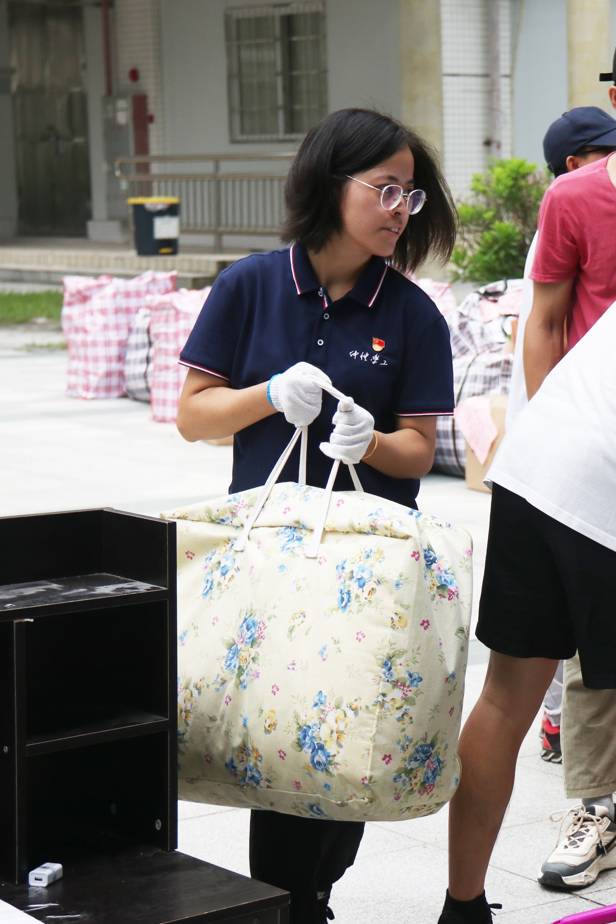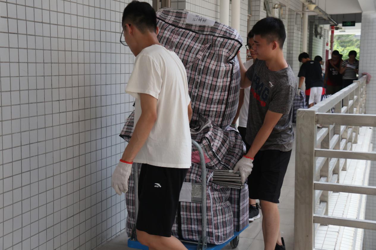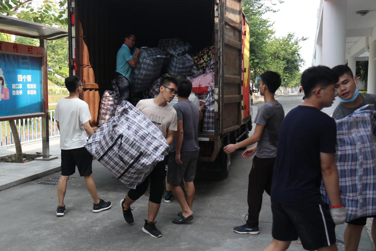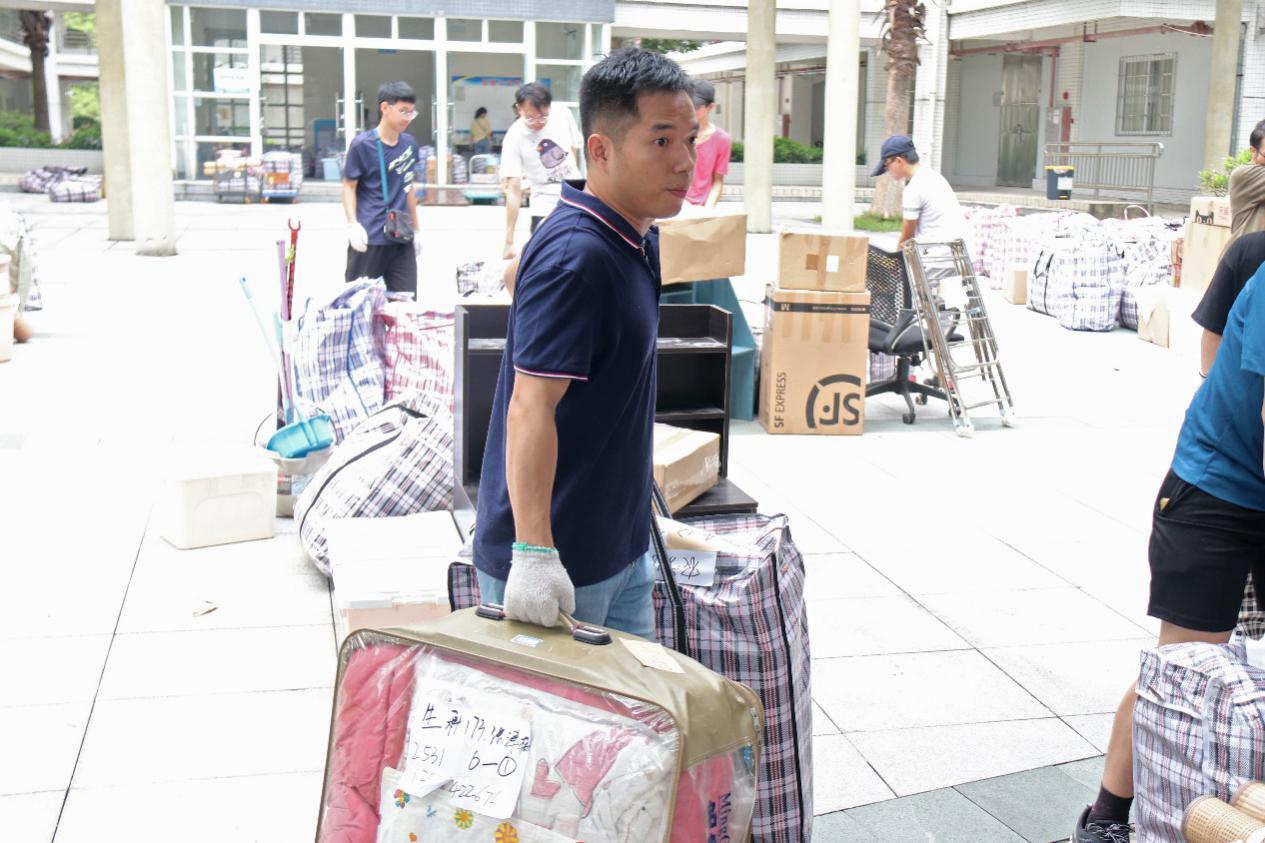 在杨钊杨勋楼暂放行李的教室里,女生志愿者认真对照着行李上标注的原宿舍标签,为其贴上对应的新宿舍的标签,男生志愿者们搬运、并协助搬运工人装车运送至3栋宿舍楼。