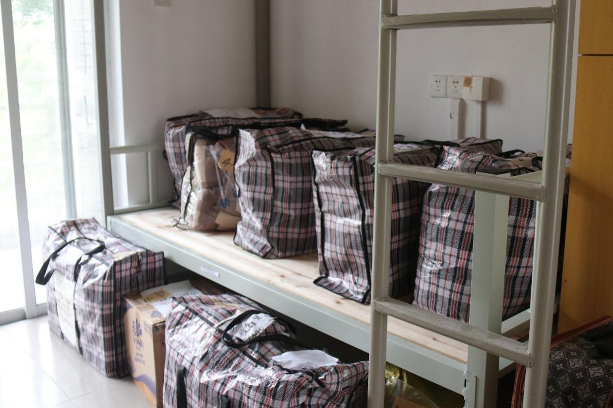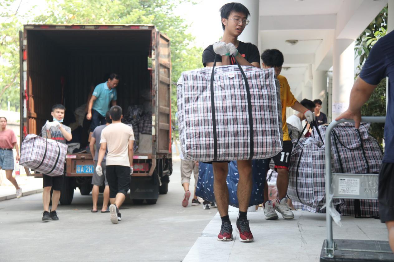 3栋宿舍楼的志愿者们将行李从货车车厢中卸下,并接力搬运至行李对应的楼层,再由分布在各个宿舍门口的核验组的志愿者们核对并登记,整齐有序地摆放至各个床位上,确保行李准确无误地送到新宿舍。