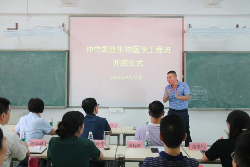 冯飞副教授首先感谢凯普生物公司对公司的支持,希望同学们可以做心中有理想、有刻苦精神、能自主学习的生物技术人才,并表示会以爱岗敬业为宗旨,恪守“注重实践,扶助农工”的校训精神,不断提高教学水平,以立德树人以己任。