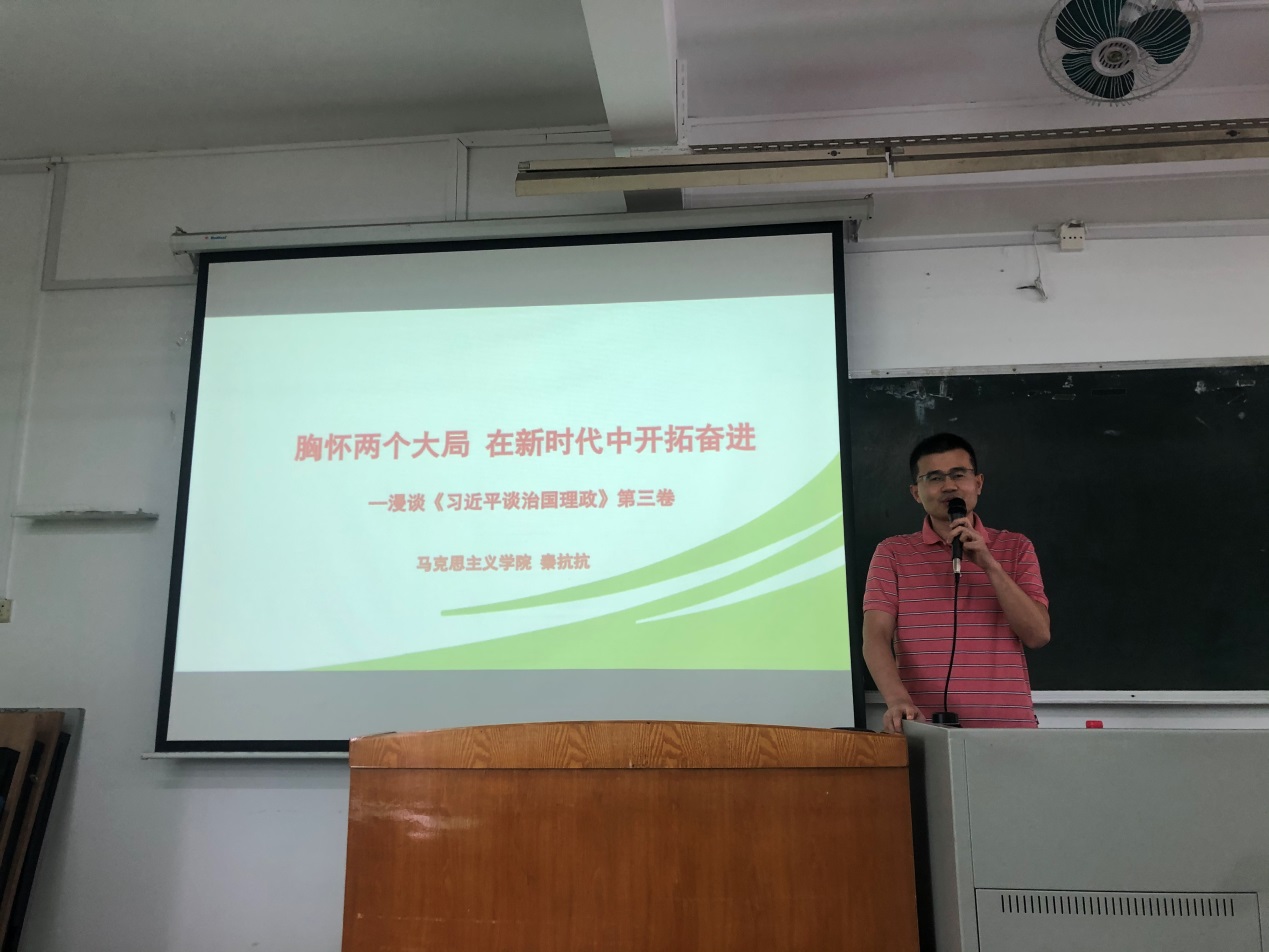 会上,马克思主义公司副经理秦抗抗就第三卷开展题为“胸怀两个大局 在新时代中开拓奋进”的报告。秦抗抗首先介绍了《习近平谈治国理政》第三卷的概况,从两个逻辑维度及国内、国际两个大局分析了第三卷各专题的逻辑结构;紧接着,分析了第三卷的内容编排的特点以及经典习语摘录讲解;然后结合农生院的实际,鼓励全体老师学习乡村振兴战略思想,坚持农业现代化和农村现代化一体设计、一并推进,实现农业大国向农业强国跨越。最后,秦抗抗提出三点感悟:第一,党员要有党员的样子,要提升素养;第二,做新时代有个性的“仲恺新农人”,要回应现实;第三,老师、员工“回”到乡村去,要增强使命感。