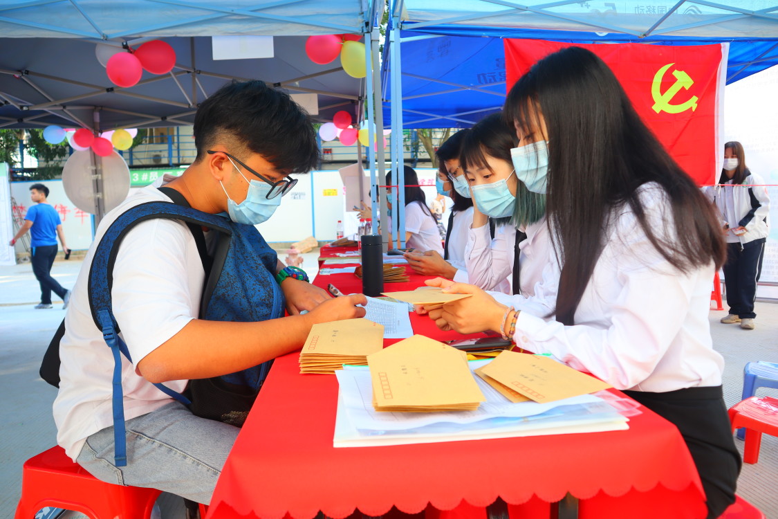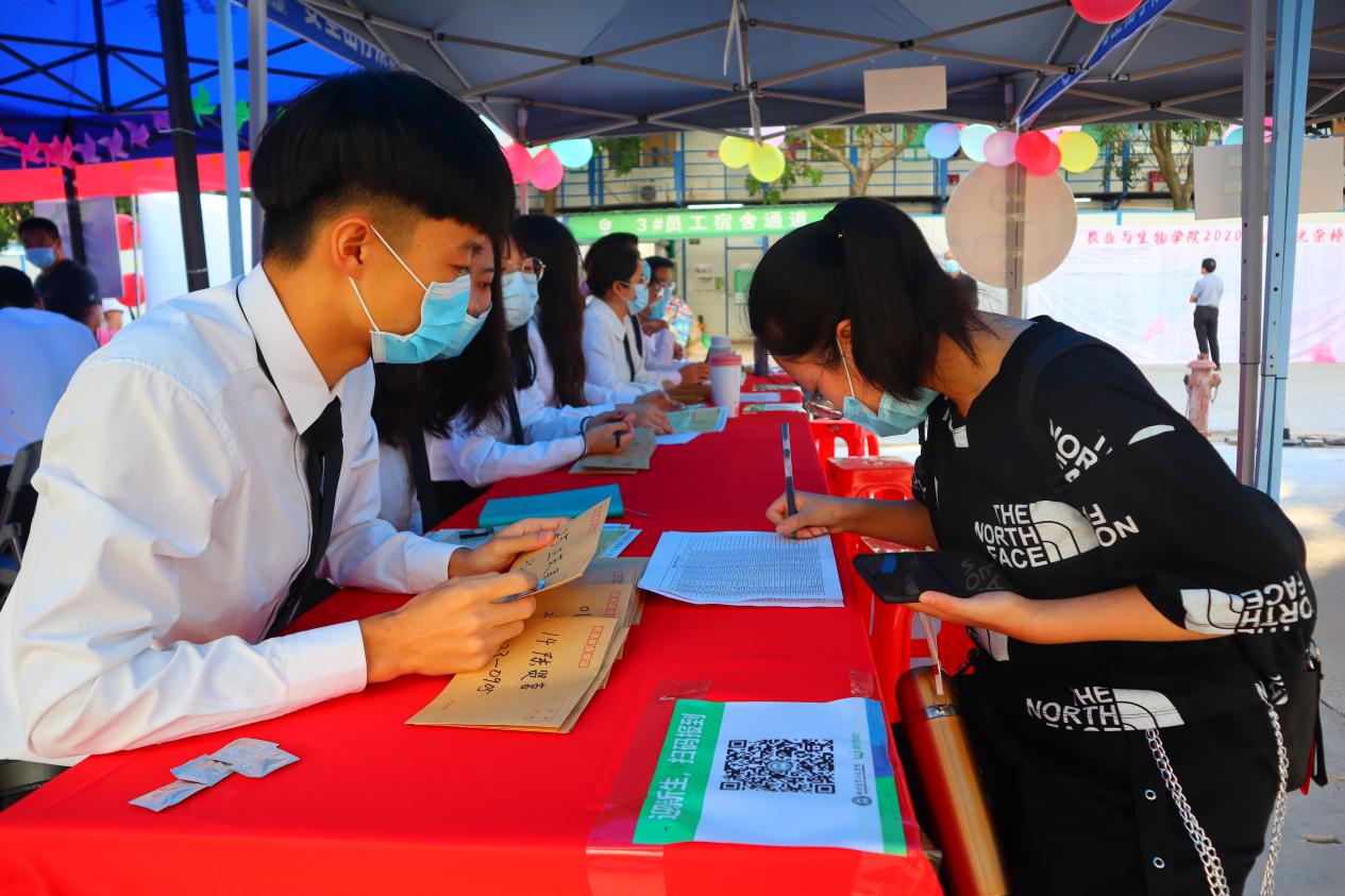助班们热情地与新生交谈,向新同学们详细介绍相关的入学手续,并发放相关入学材料。