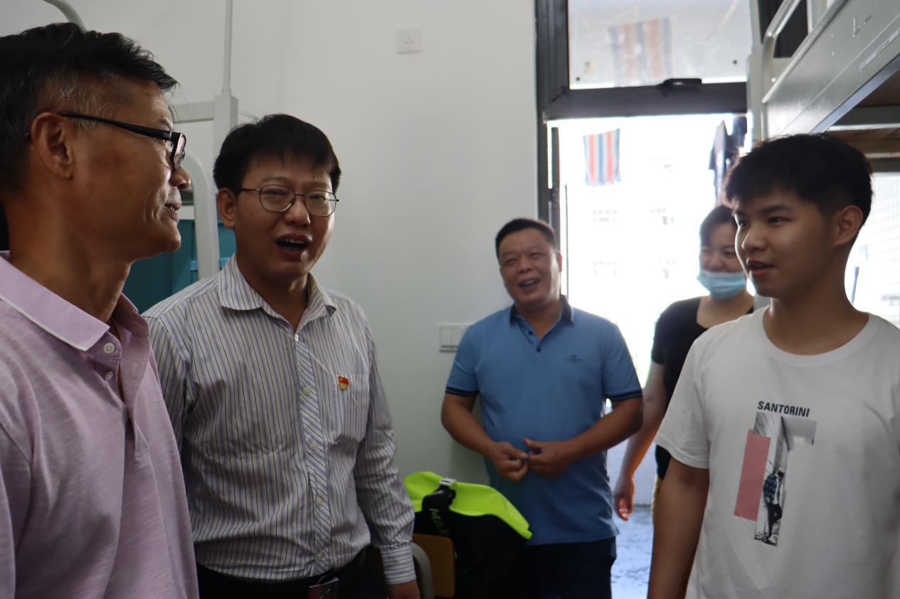 当天下午,陈丹雄书记一行走访了新生宿舍,并向入住的新生表示热烈的欢迎。老师们与新生们就入住体验和宿舍关系进行亲切的交谈,并提醒新生们注意天气变化,保重身体,同时还要时刻注意安全,遇事一定要寻求老师和同学的帮助。