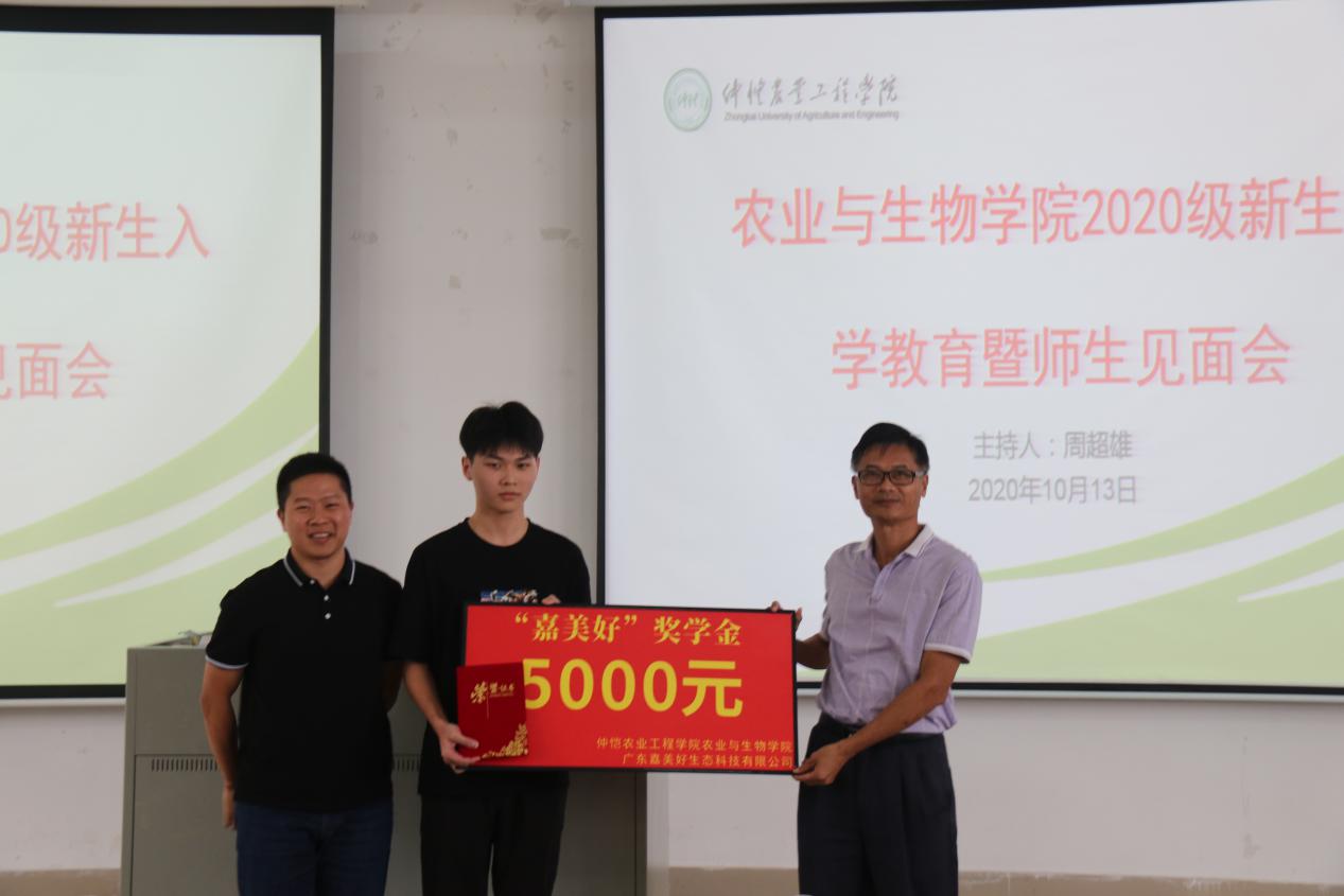 大会对公司2020级优秀本科生新生给予表彰和颁发奖学金。在“嘉美好”奖学金颁奖仪式上,公司副经理万小荣宣读表彰决定,郑奕雄经理和广东省嘉美好生态科技有限公司总经理方佳彬共同为农学201班黄俊彰同学颁发5000元的“嘉美好”奖学金和荣誉证书,以此鼓励新生们认真学习,并用所学知识回报社会。