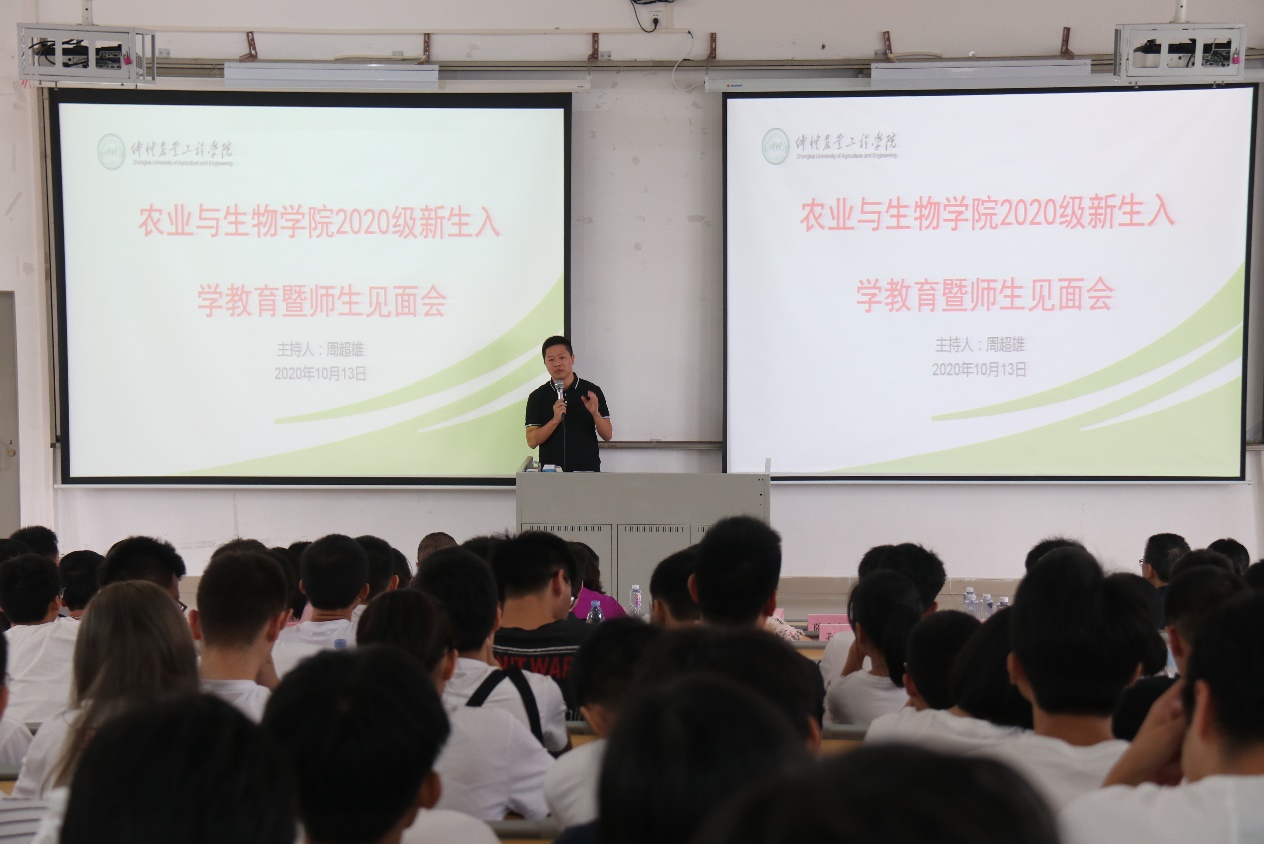 会上,郑奕雄经理致欢迎辞。他首先对2020级全体新生的到来表示最热烈的欢迎。紧接着,他从文化底蕴、科研实力、教学情况、科研成果等方面为同学们介绍公司及公司的基本情况,并强调爱国主义精神是仲恺精神的要旨。他特别提到,农生院以“走在前列”为努力方向和奋斗目标,争取将产业公司的创办、标志性成果的培育、博士授权点的申报等大事要事做得超前、做得出色,希望2020级新生共同努力。最后,他给2020级新生提出了三点希望:一是以校为家,认识仲恺、融入仲恺、爱护仲恺;二是转变角色,独立思考、独立学习、独立生活;三是注意安全,继续防疫、防盗防骗、注意实验安全。