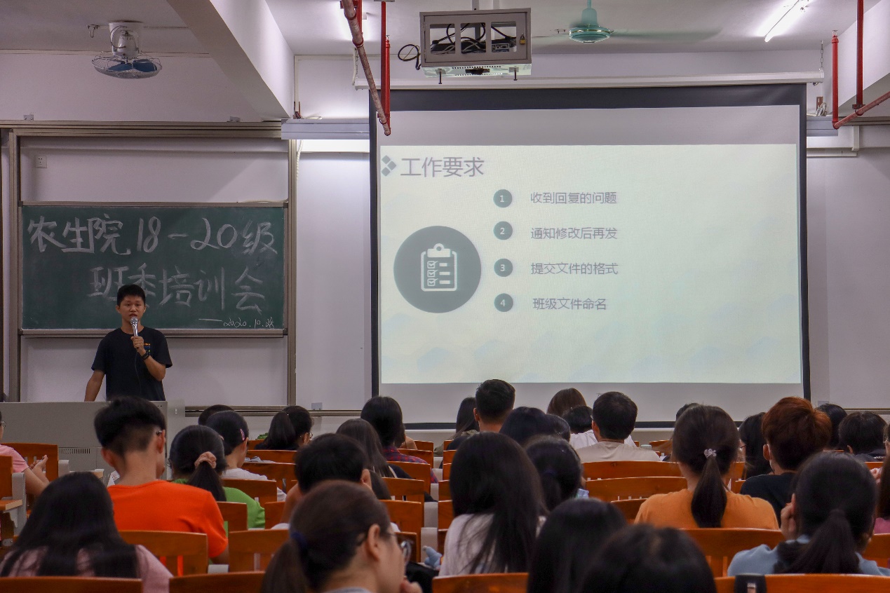 班委部代表李伟才简单介绍了班委部的成员以及主要的工作职责。他对班长提出了五点工作要求:一、收到通知时应及时回复;二、需将所接收的通知文本修改后在转发班级群;三、收集同学们提交的文件格式需统一,避免出现遗漏;四、班级文件命名需注意格式;五、认真查看所发消息。他提醒班长们在日常工作中需做好备忘,以免遗忘重要信息;信息表等重要资料需备份;在查看通知、收集和审核资料时需严谨,以免出现差错。他希望各位班长们有一颗责任心,对待事物能够细心、认真,同时能够积极配合班委部的工作。