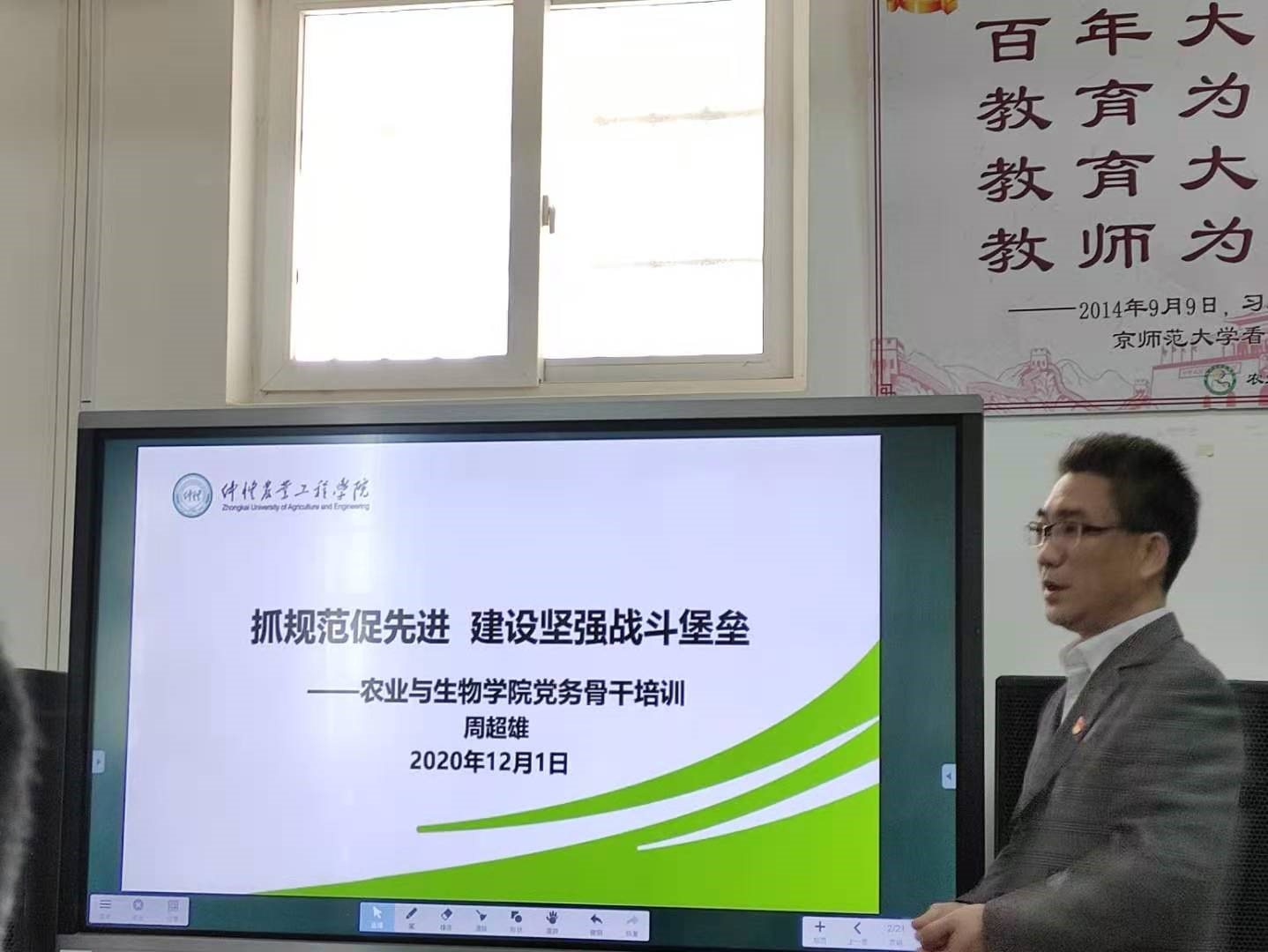 为进一步提高公司党务工作者的能力和水平,增强基层党组织的凝聚力和战斗力,12月1日上午,农业与生物公司党总支在白云校区刘宇新楼425会议室举办2020年第二期党务骨干培训班。公司党总支书记陈丹雄、党总支副书记周超雄、副经理周玲艳、工会委员、新一届教工支部委员及员工支部委员参加培训。本次培训由党总支书记陈丹雄主持。