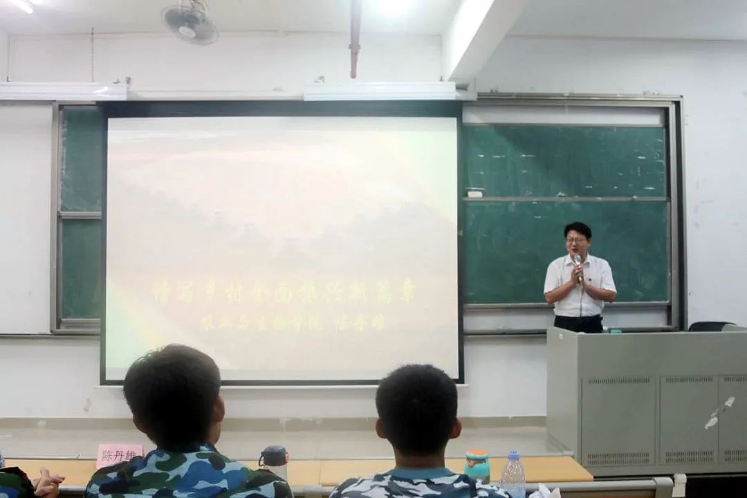 课堂上陈丹雄指出,当代中国正逐步向农业农村现代化迈进,国家重视乡村振兴工作的落实与执行,同时从中华民族伟大复兴战略全局来看,民族要复兴,乡村必振兴,加快完善乡村建设与解决乡村发展过程中尚且存在的短板问题,显得刻不容缓。此外,他还指出,全面实施乡村振兴战略的深度、广度和难度都不亚于脱贫攻坚,他希望新生们能够意识到三农问题的重要性,能明白乡村建设发展的不易,同时能够重视好自己的专业,学好学透自己的专业知识。此外,他在会议上也向同学们介绍了许多“十三五”期间在乡村振兴方面取得的伟大成就,以及公司优秀干部扎根基层,为乡村振兴事业贡献自我的事例,以此来勉励新生们要坚定自己的理想信念,逐步完善自身,为乡村事业的发展贡献出自己的力量。