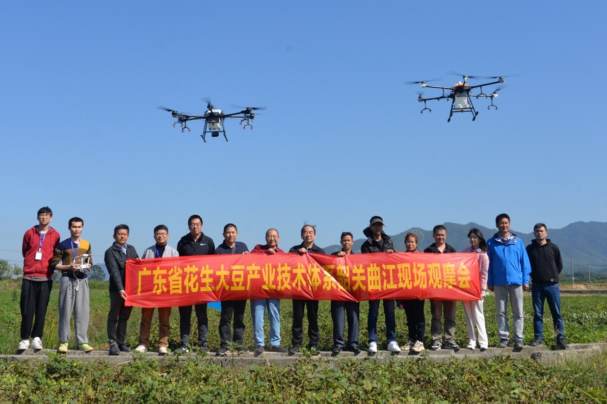 现场观摩环节,与会专家与代表深入韶关市曲江区樟市镇示范区,现场观摩了喻国辉教授带领的绿色防控岗位专家创新团队主持完成的“基于光合高脂膜应用的花生绿色高产栽培技术”展示区,以及王旭东教授带领的机械生产岗位专家创新团队展示的“无人机在花生植保上的应用”。示范区由喻国辉教授担任总指导专家,现场还展示了省花生主导品种6个、大豆主导品种1个和花生新品种(系)6个,省主推技术2项、花生栽培新技术4项,以及绿色高效生产模式4套。