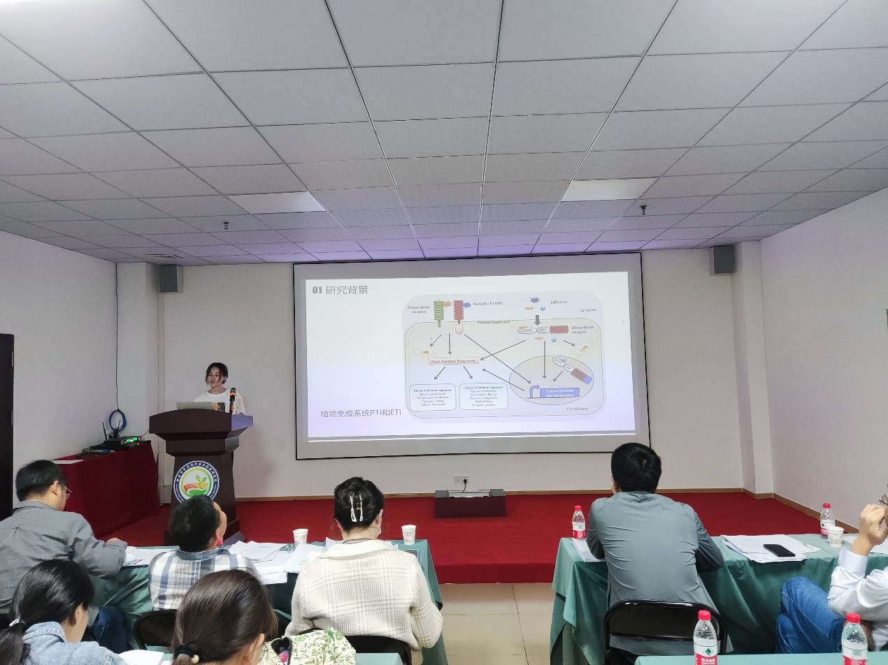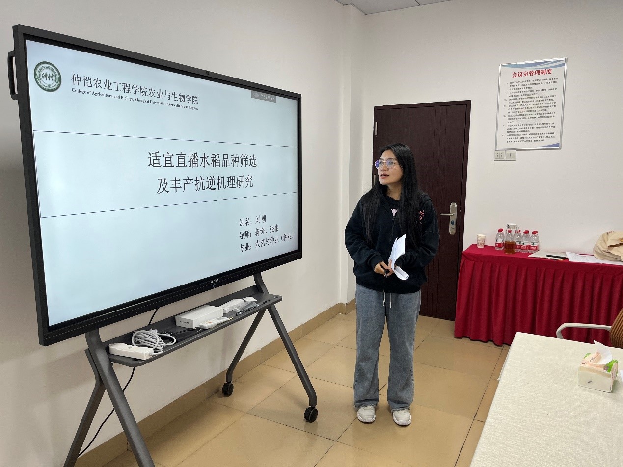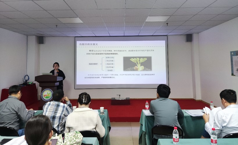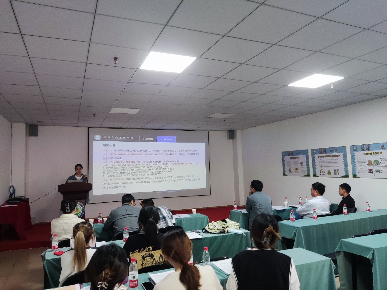 首先作物与种业方向专业负责人蒋锋副教授就研究生开题的目的意义及重要性进行发言,告诫二年级研究生要通过论文开题,明确实验主题,看清实验方向;还要搞清楚要研究什么,为什么研究它;最后通过开题报告的撰写明确实验步骤、研究思路、研究方法等。随后按研究方向将研究生分为两组进行了开题报告会。