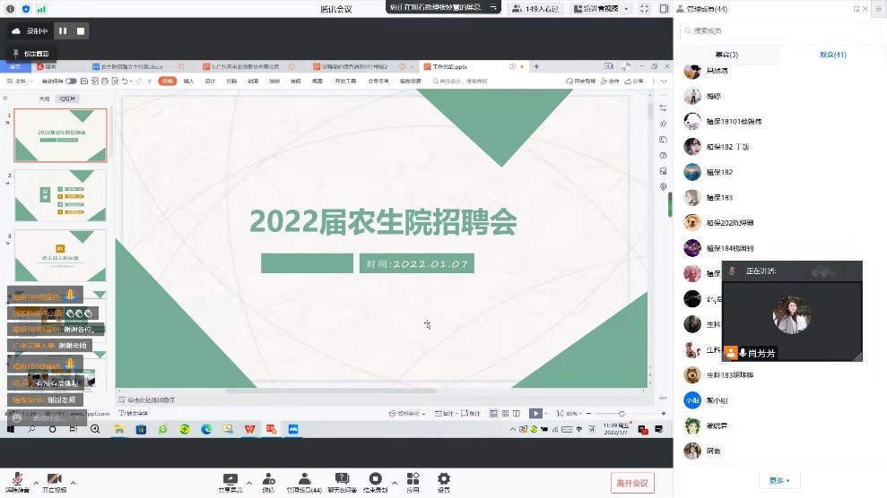 本次招聘会共邀请了北京六合华大基因科技有限公司、北京全式金生物技术股份有限公司、广东大观农业科技股份有限公司、广东植物龙生物技术股份有限公司等16家企业来公司招聘,共提供招聘岗位300多个,涉及农学、植保、种科、生技、生科等公司全部专业。 会上,用人单位以PPT形式进行宣讲、发布招聘信息,与毕业生进行线上交流,部分毕业生与用人单位达成初步就业意向。