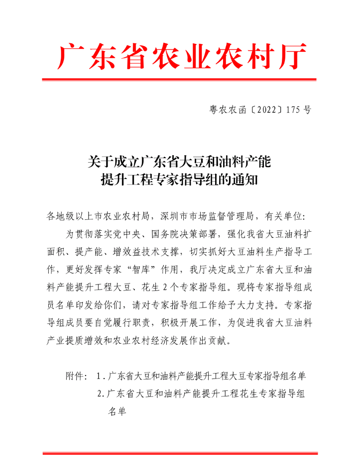 为贯彻落实党中央、国务院决策部署,强化我省大豆油料扩面积、提产能、增效益技术支撑,切实抓好大豆油料生产指导工作,更好发挥专家“智库”作用,广东省农业农村厅决定成立广东省大豆和油料产能提升工程大豆、花生2个专家指导组。专家指导组成员自觉履行职责,积极开展工作,为促进我省大豆油料产业提质增效和农业农村经济发展作出贡献。