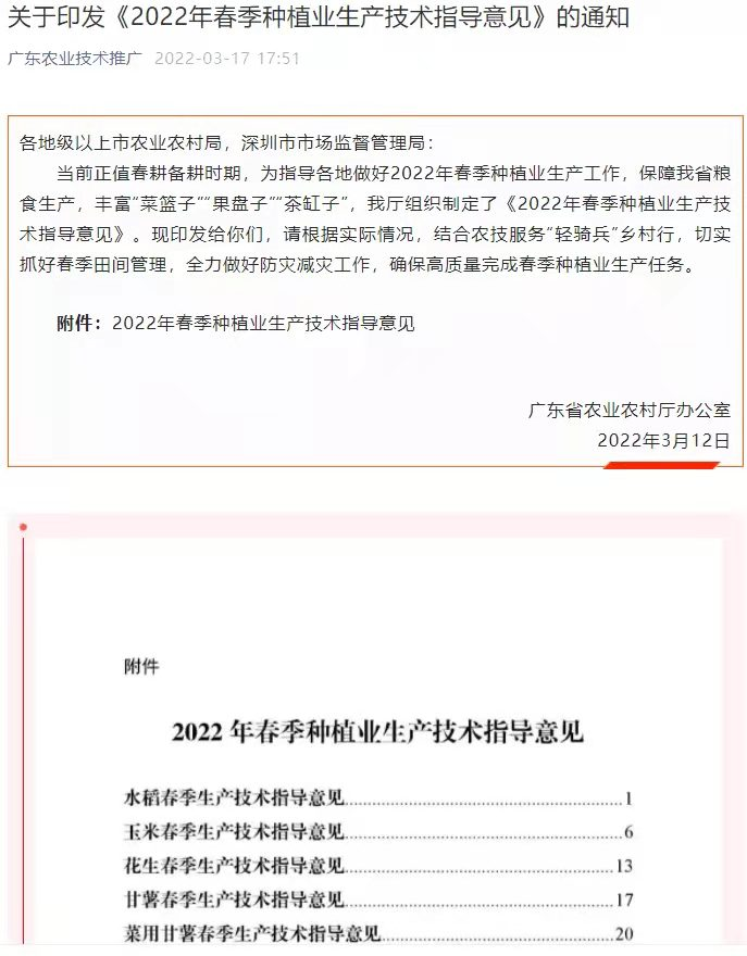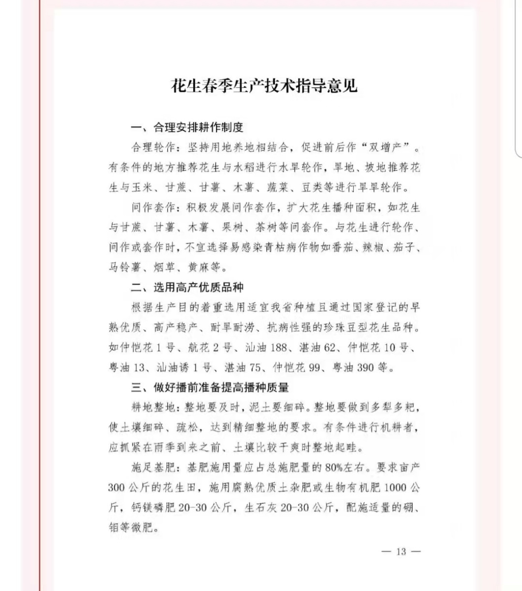 为贯彻落实省委、省政府有关春耕工作的部署,积极响应春季农业生产计划,由公司经理、国家大豆和油料产能提升工程专家指导组成员、郑奕雄教授撰写的《花生春季生产技术指导意见》和公司刘鹏飞博士撰写的《玉米春季生产技术指导意见》一同成功入选广东省《2022年春季种植业生产技术指导意见》。其中郑奕雄教授撰写的《花生春季生产技术指导意见》从合理安排耕作制度、选用高产优质品种、做好播前准备提高播种质量、适期抢晴提早播种、加强田管注重防控、适时收获确保丰收这六个方面具体介绍了有关花生春季科员工产的技术。