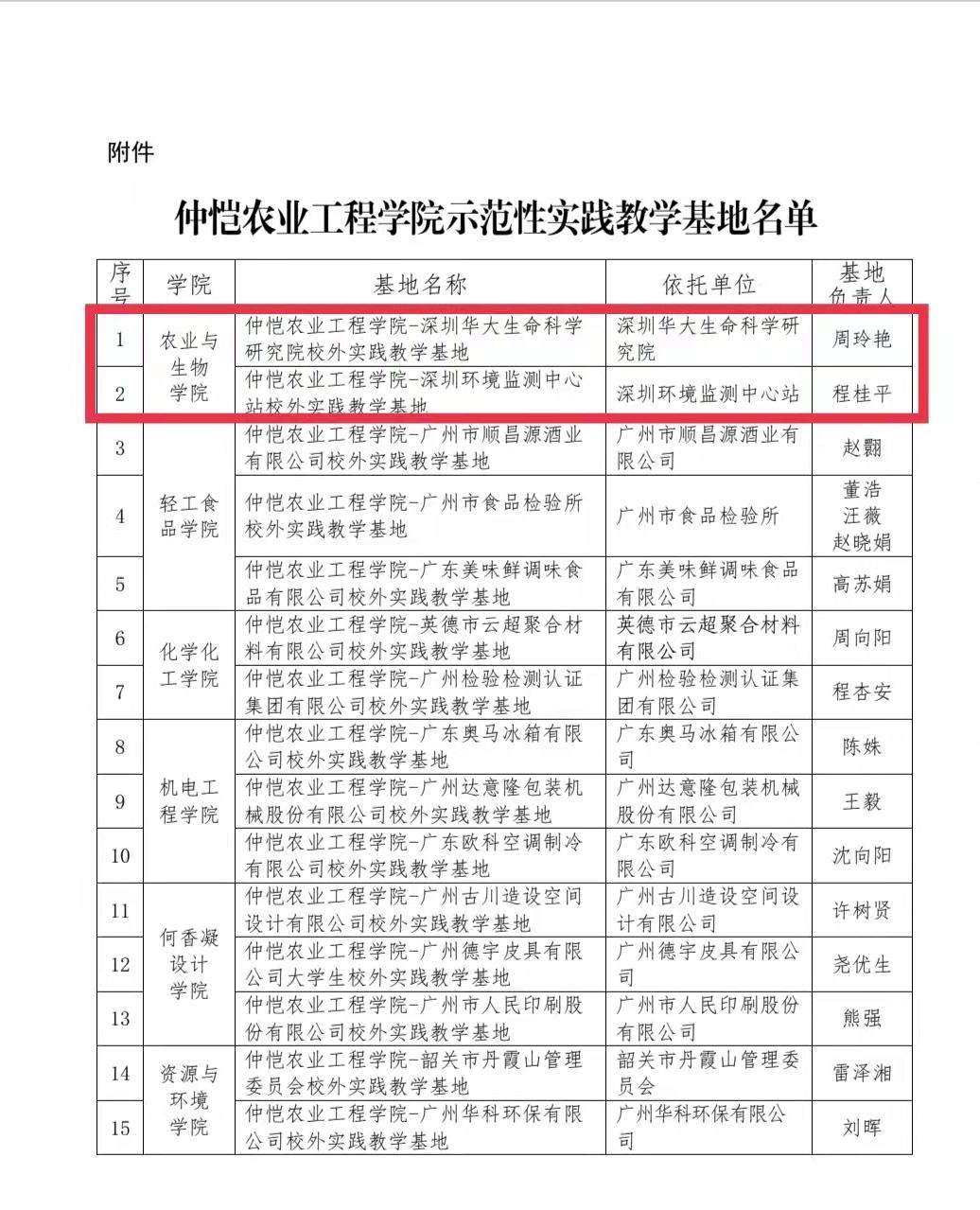 根据《关于开展best365官方网站示范性实践教学基地遴选工作的通知》(仲教字〔2021〕54 号),公司组织了示范性实践教学基地遴选工作。经各单位申报、专家评审、教学指导委员会及教学管理委员会审议、公示,遴选出 15 个基地为公司示范性实践教学基地,best365官网入口注册的仲恺农业与工程公司-深圳华大生命科学研究院校外实践教学基地、best365官方网站-深圳环境监测中心站校外实践教学基地成功入选为示范性实践教学基地。