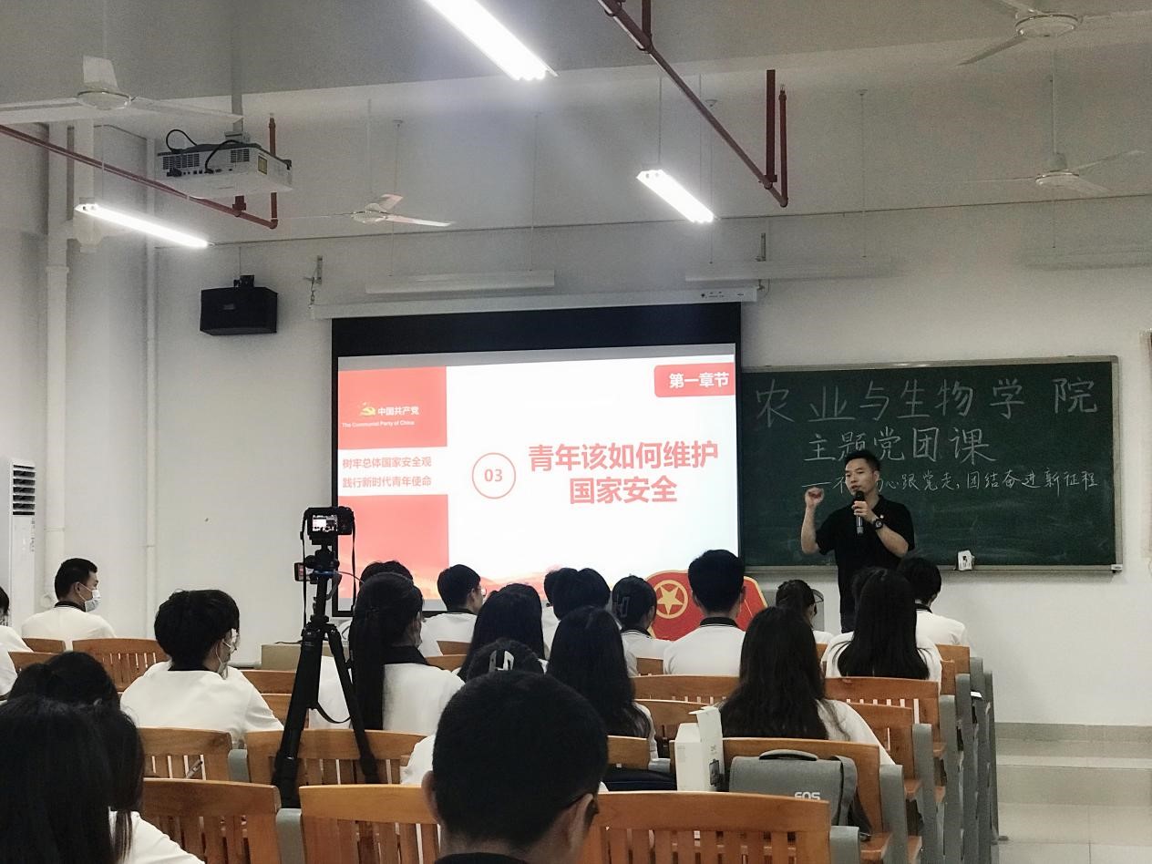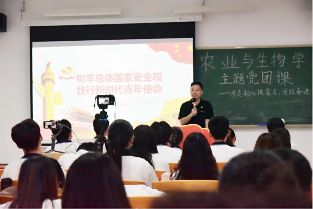 首先由苏登开讲以“树牢总体国家安全观,践行新时代青年使命”为主题的党团课。他先从国家安全的内涵、方面等多个角度向我们解释了国家安全的含义,并举出多个实际例子配合理解。接着他向我们介绍了如香港修例风波、新冠疫情、中印边境冲突等危害国家安全的事例,并告诫我们要提高警惕意识,切勿在一些看似小事的事情上掉以轻心,危害国家安全。最后他向我们提出三点建议关于青年应该如何维护国家安全,一是青年应增强忧患意识,时刻有忧患意识。二是青年应树立国家安全利益高于一切的理念。三是青年要做奋斗者,求真学问,练真本领。同时,他也向农生学子提出希望,把个人发展与祖国发展结合起来,学习真本领来维护国家安全。