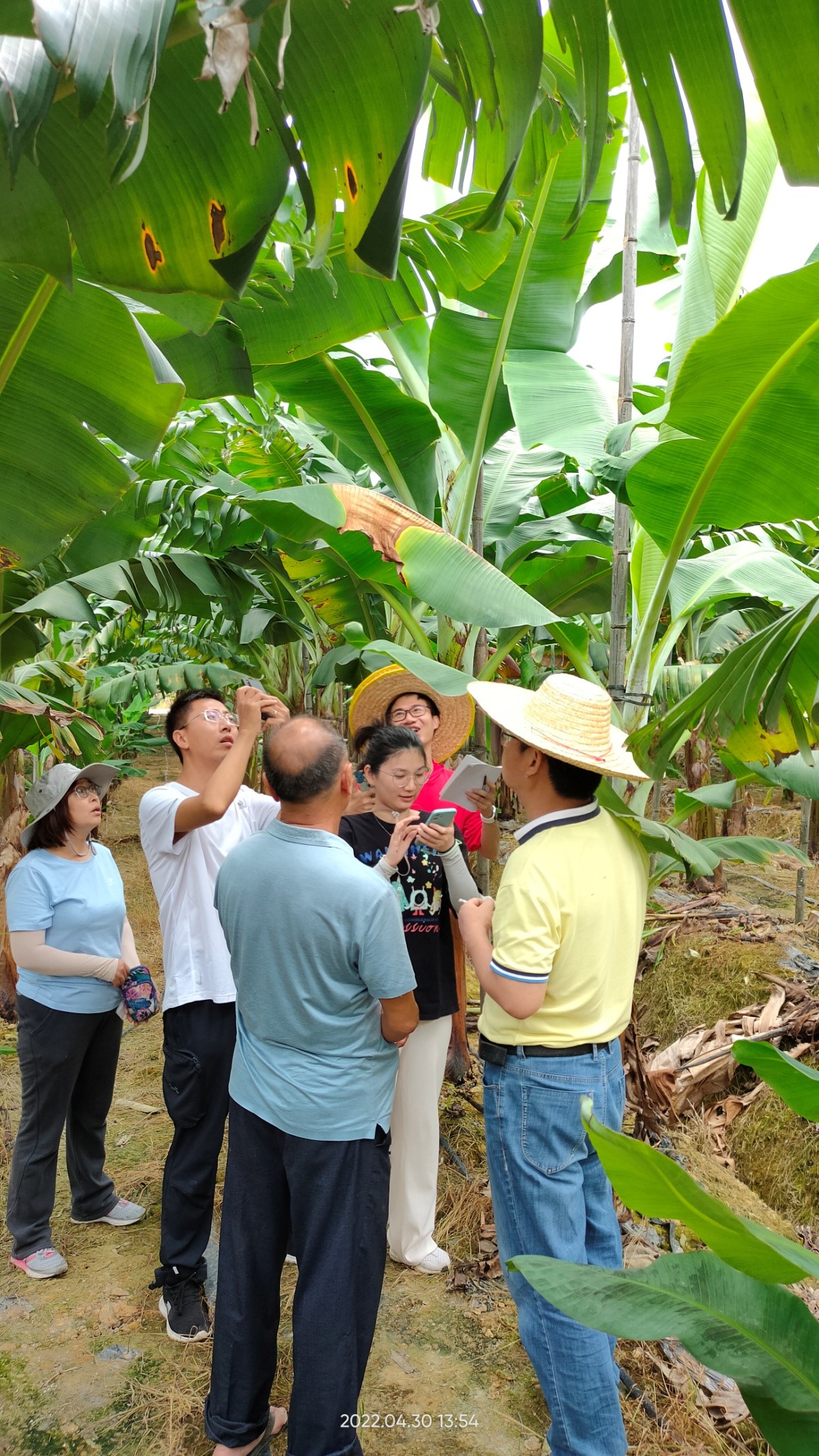 不误农时,助力春耕,趁着疫情得到有效控制和五一假期,best365官方网站植物健康创新研究院执行副经理喻国辉教授及其团队成员一行于2022年4月30日到恩平市开展苹果粉和巴西蕉病害发生情况调查和春耕生产指导。恩平市圣堂镇及其周边的乡镇大规模栽培国家主推品种粉杂1号的时间较久,因长期连作,导致鞘腐病发生严重。植物健康创新研究院从2020年开始在圣堂镇的2家合作社和1家种植公司设定固定观测点,并在2021年将该地设为广东省普通高校果蔬病虫害绿色防控重点实验室的生物防控示范站。