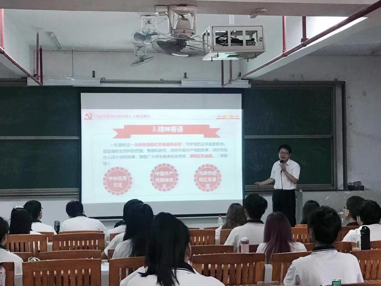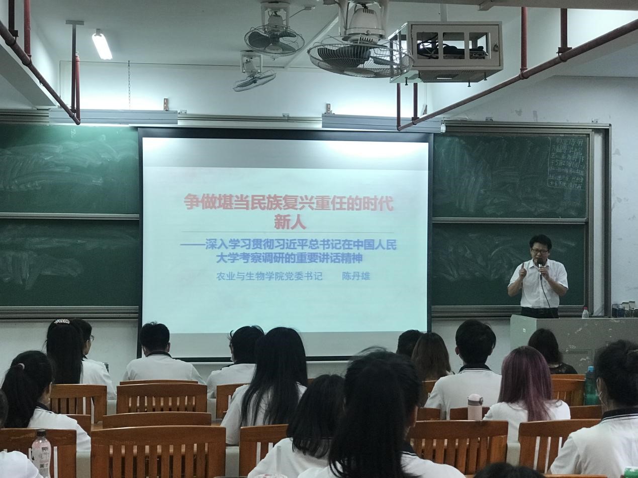 通过对国内外局势的分析,陈丹雄对作为青年的同学们提出了四大寄语。一是指引方向,他希望同学们成为社会主义合格的接班人,强调要坚定不移听党话、跟党走,要争做民族复兴的时代新人。二是确立价值坐标,倡导学习社会主义核心价值观,在个人方面切实履行时代赋予我们的责任,尤其是在疫情当下,不造谣、不传谣,坚定我们的立场,向英雄学习、向前辈学习、向榜样学习。三是赓续红色血脉,从志气、底气、骨气三气勉励同学们要坚定“四个自信”,要把中华优秀文化、中国共产党人精神谱系、光荣传统红色基因这三条红色血脉赓续传承。同时引伸到每个农生学子身上,农行天下、生生不息,用农业知识去服务国家农业体系,无论遇到顺境亦或是逆境,都要去勇敢地奋斗拼搏。四是奋斗寄语激昂奋斗青春,希望同学们用脚步去丈量祖国大地,用眼睛发现中国精神,用耳朵倾听人民呼声,用内心感应时代脉搏,把对祖国血浓于水、与人民同呼吸共命运的感情贯穿学业全过程、融汇在事业追求中。