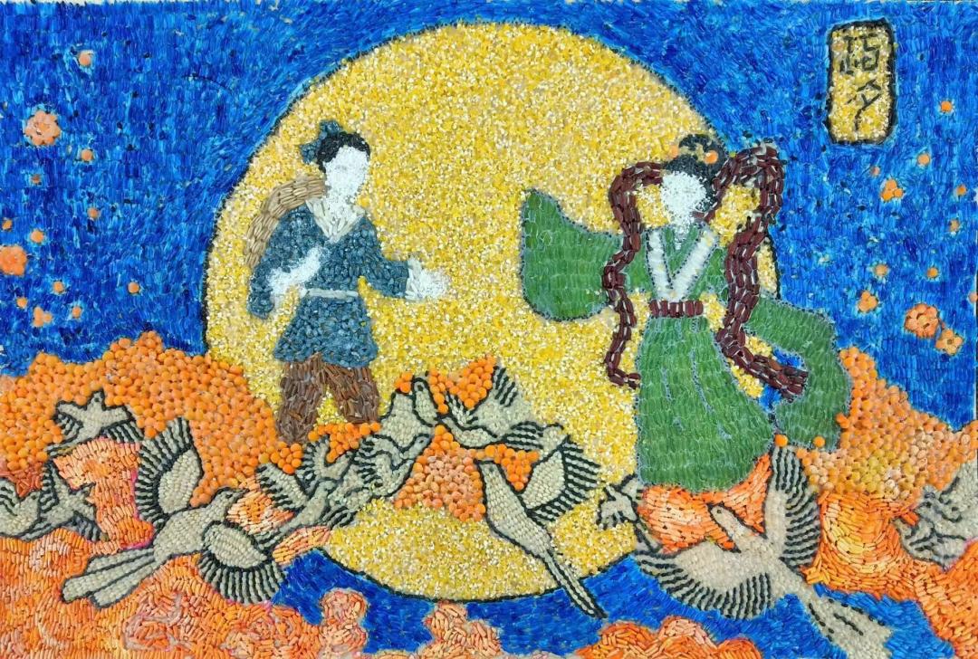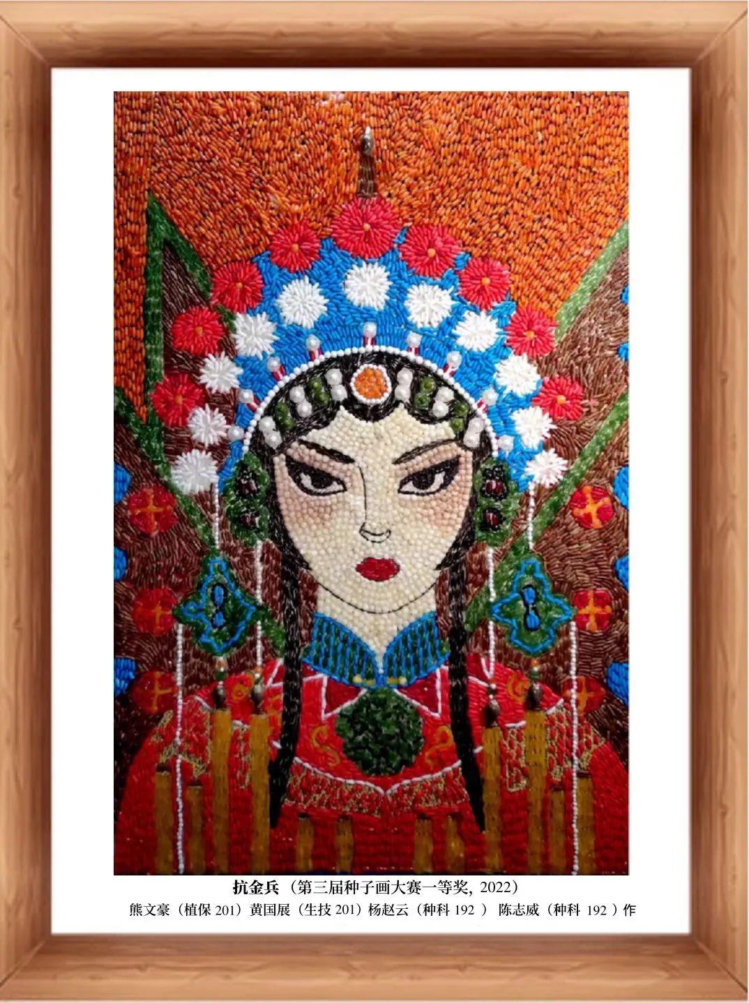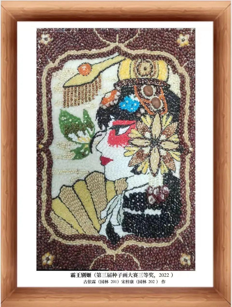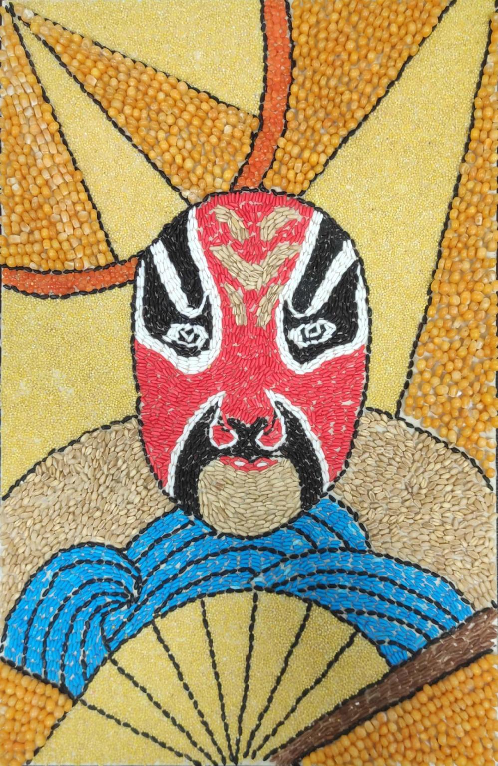 作品致敬经典《霸王别姬》,假霸王,真虞姬,程蝶衣终醒悟自己一直活在角色中。程蝶衣所饰虞姬正如蝴蝶一般美丽,这部经典也因此成为掀起人们心中风暴的蝴蝶。京剧是中国传统艺术宝库的一颗明珠,选择京剧中最为经典的人物来创作种子画,为了向在校全体师生宣传国粹京剧经典的奇特的魅力。