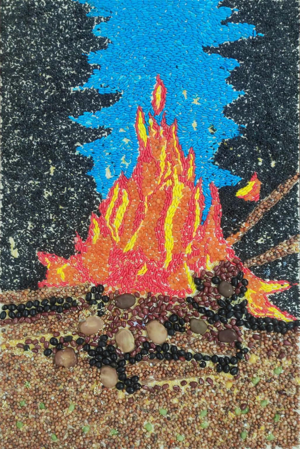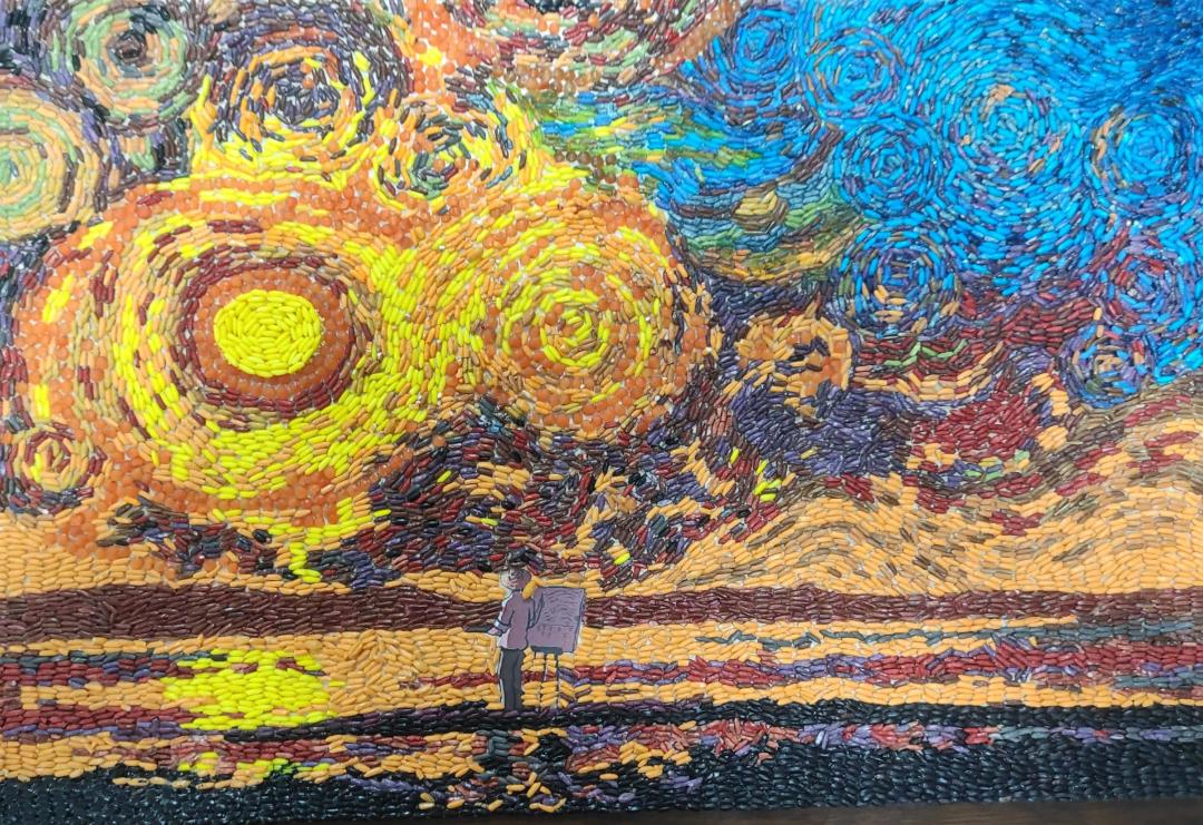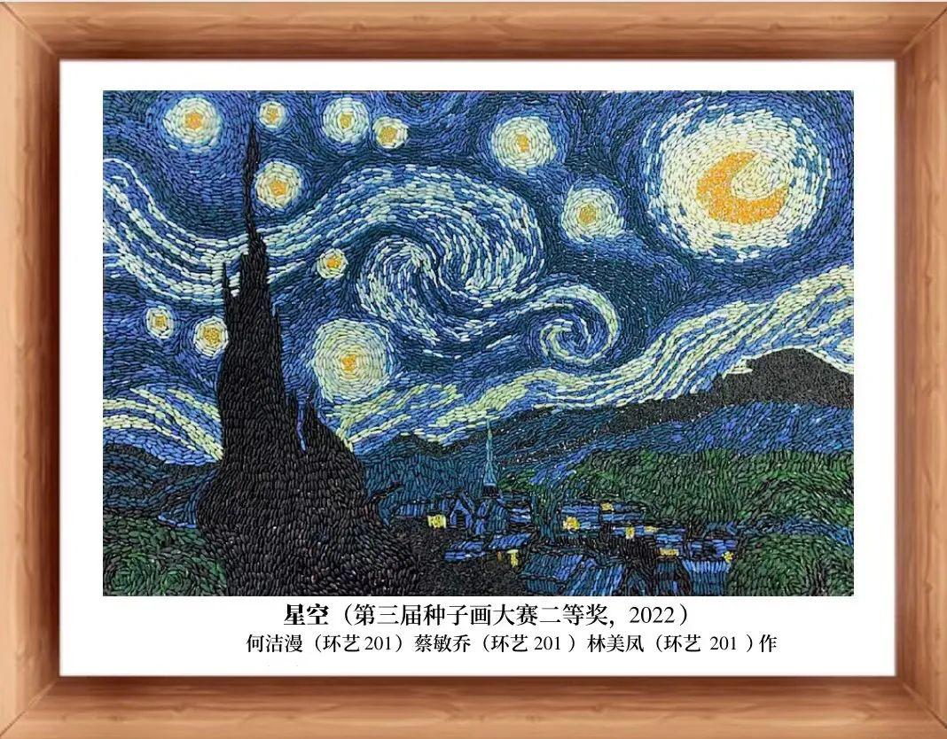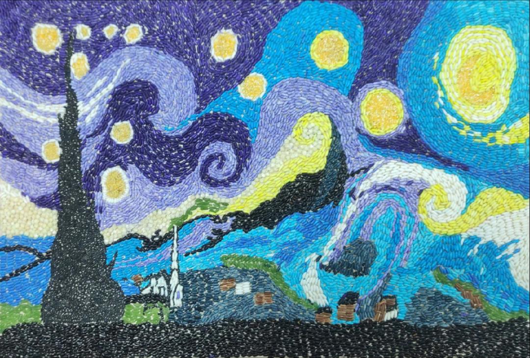 《星空》是后印象派画家梵·高的代表作之一。由种子粘贴点缀成夜空中的星光、城镇下的村庄,画面不仅和谐,更与梵高先生的作品画法相映合,形成另一种艺术风格!因此我们选定梵高先生代表作《星空》进行了二次创作,重新简化描绘,保留特征笔触,概括颜色方便使用种子粘贴表达画面!