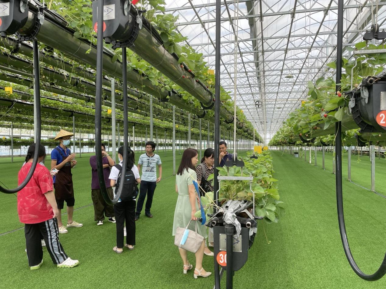 公司副总经理王春生带领师生参观了大型水培蔬菜生产间及空中草莓滴灌栽培园。工作人员为员工讲解了相关栽培技术要点,这些园区集自动化作业、智能化控制、工厂化生产、无土化培育、立体化种植等高新技术于一体,员工收获颇丰。
