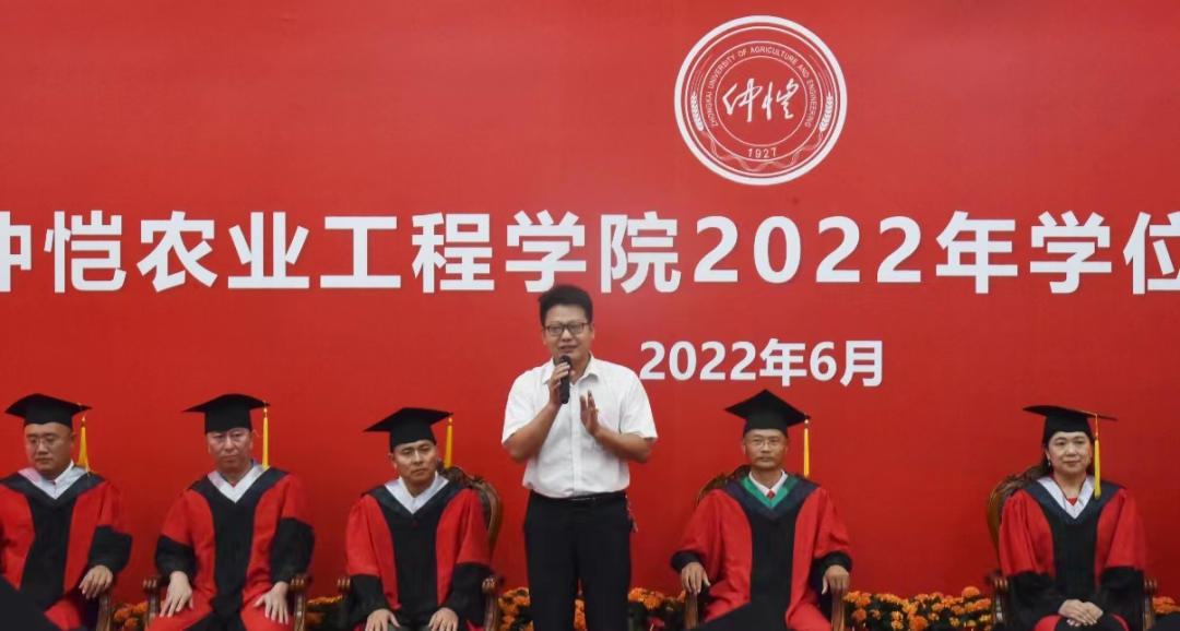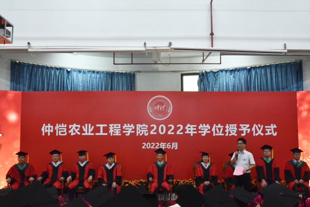 拨穗正冠是老员工毕业授学位时的一种礼节,象征毕业生已学有所成,可以展翅高飞。郑奕雄为农生院18级毕业生逐一拨穗、授予学位并合影留念,场面温情满满。接着,周超雄对公司全体毕业生顺利毕业、取得学士学位表示热烈祝贺,并希望他们不忘母校,谨遵老师教诲,用底气、锐气、骨气、正气四气坚持中国特色社会主义道路自信、理论自信、制度自信与文化自信四个自信;锐意进取,再创辉煌。随后,他一一介绍到场的导师们,并对他们的到来表示热烈欢迎。