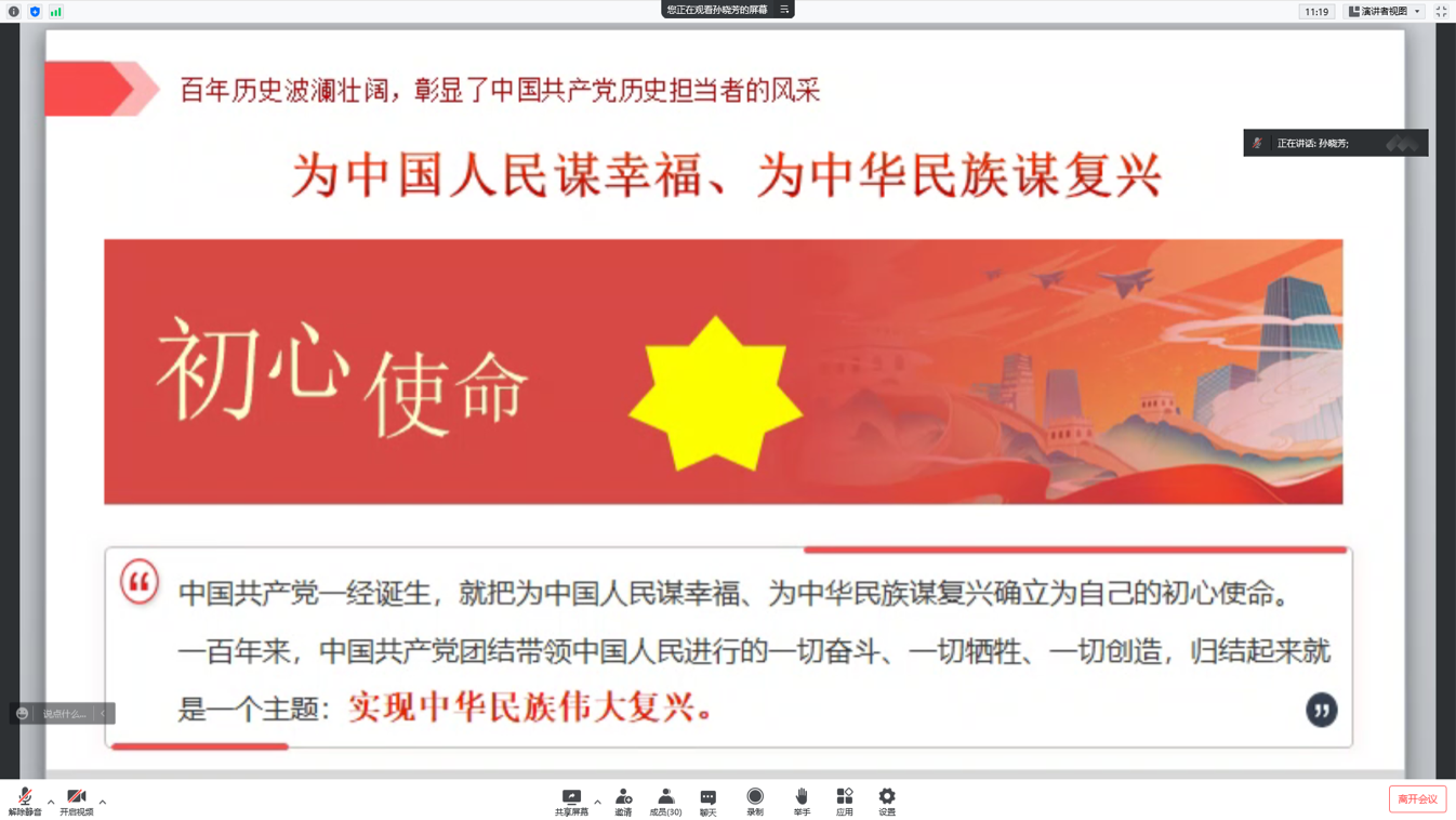 会上,孙晓芳从“百年历史波澜壮阔,彰显了中国共产党历史担当者的风采”讲起,阐述了中国共产党“为中国人民谋幸福、为中华民族谋复兴”的初心使命。从1921年建党至今,中国共产党始终站在时代潮流最前列、站在攻坚克难最前沿、站在最广大人民群众之中,以顽强的定力、坚韧的意志、卓越的智慧,跨越各种艰难险阻,不断取得新的胜利。