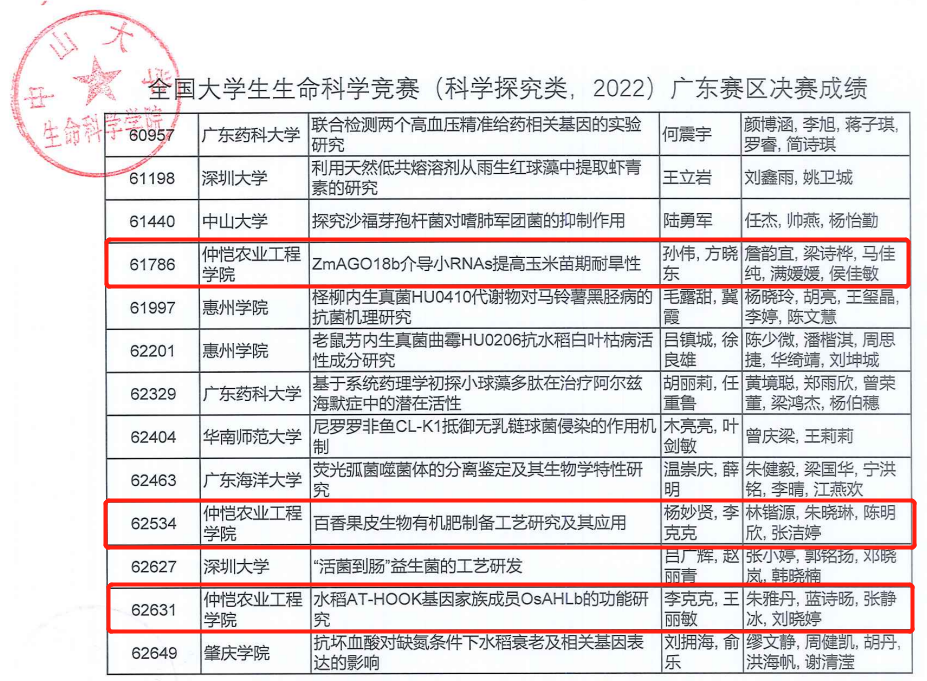 其中,由黄杰豪等主持的《水稻抽穗期基因DHD2的鉴定及功能研究》(指导老师:唐辉武、王丽敏)获得全国老员工生命科学竞赛广东赛区一等奖,并入围全国决赛;由詹韵宜等主持的《ZmAGO18b介导小RNAs提高玉米苗期耐旱性》(指导老师:孙伟、方晓东)、林锴源等主持的《百香果皮生物有机肥制备工艺研究及其应用》(指导老师:杨妙贤、李克克)、朱雅丹等主持的《水稻AT-HOOK基因家族成员OsAHLb的功能研究》(指导老师:李克克、王丽敏)、李杰辉等主持的《LncRNA调控褐飞虱繁殖力的分子机制探究》(指导老师:刘凯、李春梅)、陈丽丽等主持的《南板蓝内生及根际放线菌的多样性及抑菌活性研究》(指导老师:孙辉)分别获全国老员工生命科学竞赛广东赛区三等奖。