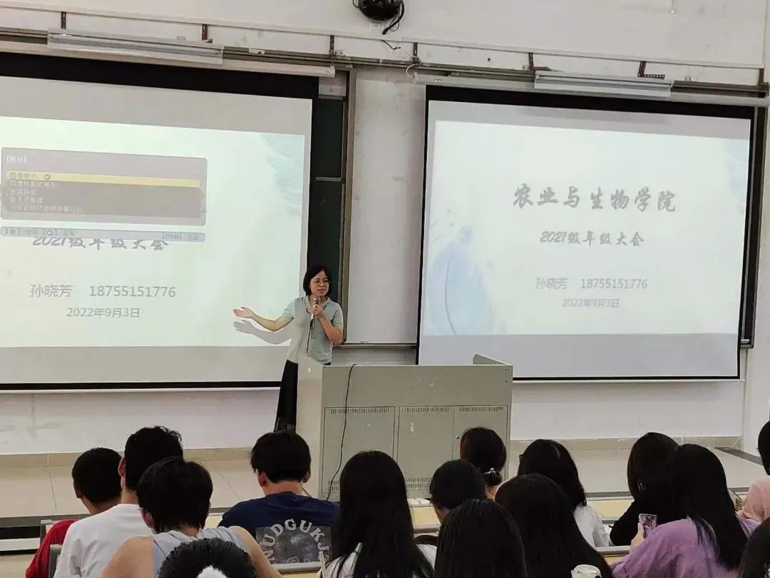 最后,21级新辅导员孙晓芳上台向大家做了自我介绍,并表示今后将接管21级的生物技术专业、生物科学专业和产业班。她希望同学们要高度重视学业问题,遵守公司规章制度,做到不旷课、不迟到、不早退,对自己的老员工涯负责,做一名有理想、有规划、有行动的老员工,对未来三年的老员工活要提前做好规划,对今后的人生道路要有更清晰的思考和想法。她强调,在疫情期间,同学们要注重自身安全,严格执行疫情期间的请假审批流程。作为一位带过几届毕业生的辅导员,对于毕业生就业工作方面有着较为丰富的经验,她表示,同学们如果在生活和学习方面遇到任何困难,都可以主动向她寻求帮助,她将尽心尽责地为同学们做好服务工作。