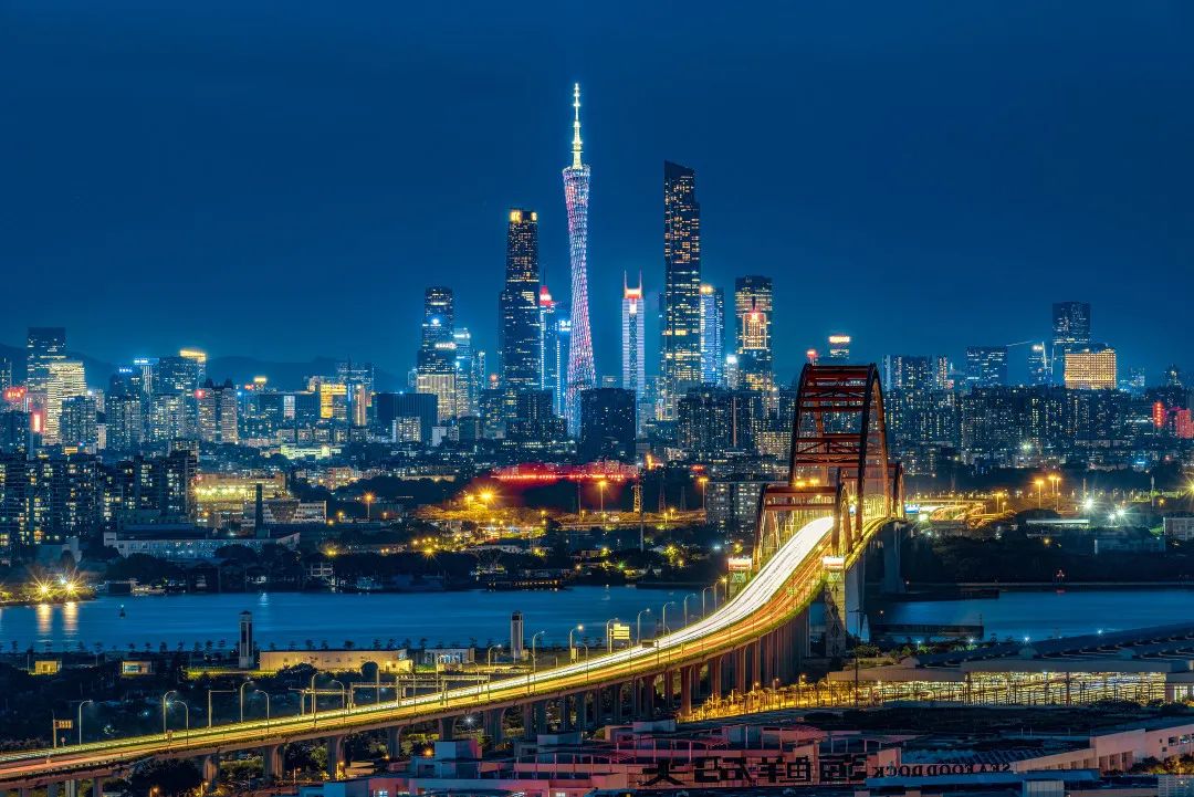 傍晚是新光大桥最美的时候,桥上车流流光璀璨,两岸灯火辉映色彩把大桥装点得更耀眼夺目。不远处的珠江新城夜景更是绚丽多姿,在蓝调时刻初上之际,我看着车水马龙的大桥,看着这繁华的盛世,深深地为我的祖国骄傲、自豪!