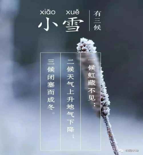 古代将小雪分为三候:一候虹藏不见;二候天气上升;三候闭专塞而成冬。