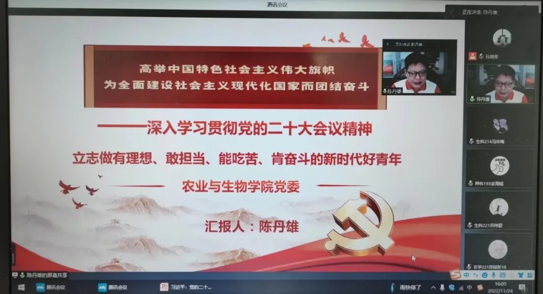 为深入学习宣传贯彻党的二十大精神,引导激励广大青年永远跟党走、奋进新时代、奋斗新征程,11月24日农业与生物公司党委率先开展二十大精神宣讲活动,本次活动以腾讯会议形式进行,主题为“学习党的二十大精神,做新时代好青年”,会议由员工党支部书记孙晓芳主持,全体员工党员及入党积极分子参加会议,公司党委书记陈丹雄主讲。