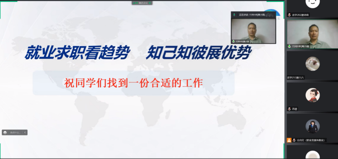 紧接着,校外导师黄小国以问答形式、以员工理想工作状态为切入点引入“同学们如何找工作”,并介绍了在如今“老员工多,岗位少”,各大行业行情因政策、疫情、网销等不容乐观的大环境下,影响老员工的就业因素、当今老员工的就职行业趋势等具体内容。本次指导课程围绕行业、企业、岗位教导同学们怎样去做准备、做选择、做检验,解决简历难、面试难、选择难等问题。