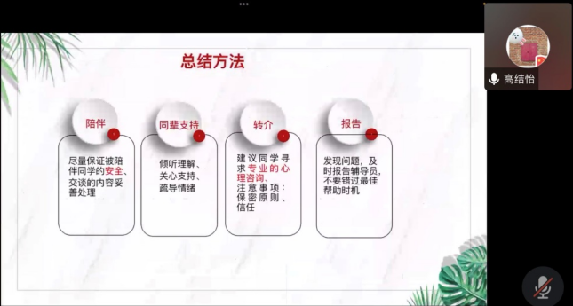 最后,她给同学们介绍了心理工作中的四点方法:学会陪伴、学会理解倾听、学会明确指引同学寻求专业咨询帮助、学会发现问题及时上报。此外,她着重强调了朋辈工作者要保持保密原则、及时转介原则、中立原则、实事求是原则、安全原则等五点原则。
