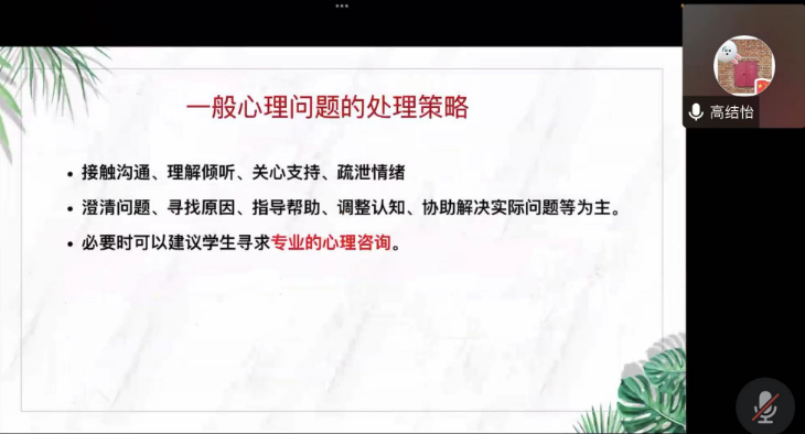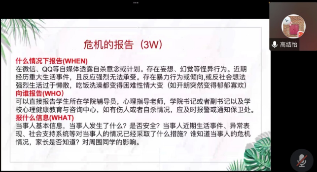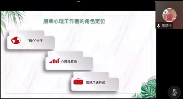 而后,她向大家介绍了一般性心理问题、非精神病性疾病、精神病性心理疾病以及其应对策略。她强调,朋辈心理工作者要多关注身边同学的心理问题且做到对患有心理问题的同学采取多关心、不歧视、无偏见的态度,如遇问题,可在力所能及的范围内给予帮助,同时要及时上报辅导员或公司心理中心。